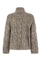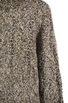 FINE WORKMANSHIP AND PRECIOUS YARNS MEET IN THE DAZZLING CHINé TURTLENECK SWEATER, MADE OF SOFT WOOL, CASHMERE AND MOHAIR. THE GARMENT IS CHARACTERISED BY A CLASSIC PLAIT PATTERN, MADE SOFT AND SLIGHTLY VOLUMINOUS THANKS TO THE SPECIAL STRUCTURE OF THE YARN. THE CHINé EFFECT, OBTAINED BY INTERWEAVING FIBRES OF DIFFERENT SHADES, CREATES A REFINED UNEVEN COLOUR PLAY THAT GIVES DEPTH AND MOVEMENT TO THE SURFACE. THIN THREADS OF SEQUINS INSERTED IN THE WEAVE ADD REFINED HIGHLIGHTS, EMPHASISING THE FEMININE ELEGANCE OF THE PATTERN. THE SLIGHTLY CROPPED LINE, WIDE SLEEVES AND DROPPED SHOULDERS DEFINE A SOFT AND CONTEMPORARY VOLUME. THE YARN COMBINES THE SOFTNESS OF VIRGIN WOOL FIBRES, THE FLUFFY LOOK OF MOHAIR AND THE SOFT TOUCH OF CASHMERE TO CREATE AN ENVELOPING GARMENT WITH A VERY SOFT HAND. THE CHINé WORK GIVES THE GARMENT AN UNEVEN EFFECT, WHILE A FINE THREAD OF SEQUINS EMBELLISHES THE ENTIRE SURFACE WITH DELICATE REFLECTIONS OF LIGHT. - HIGH COLLAR - DROPPED SHOULDER - WIDE SLEEVE - BRAIDED KNIT DESIGNER ID: MGR372904 CME31