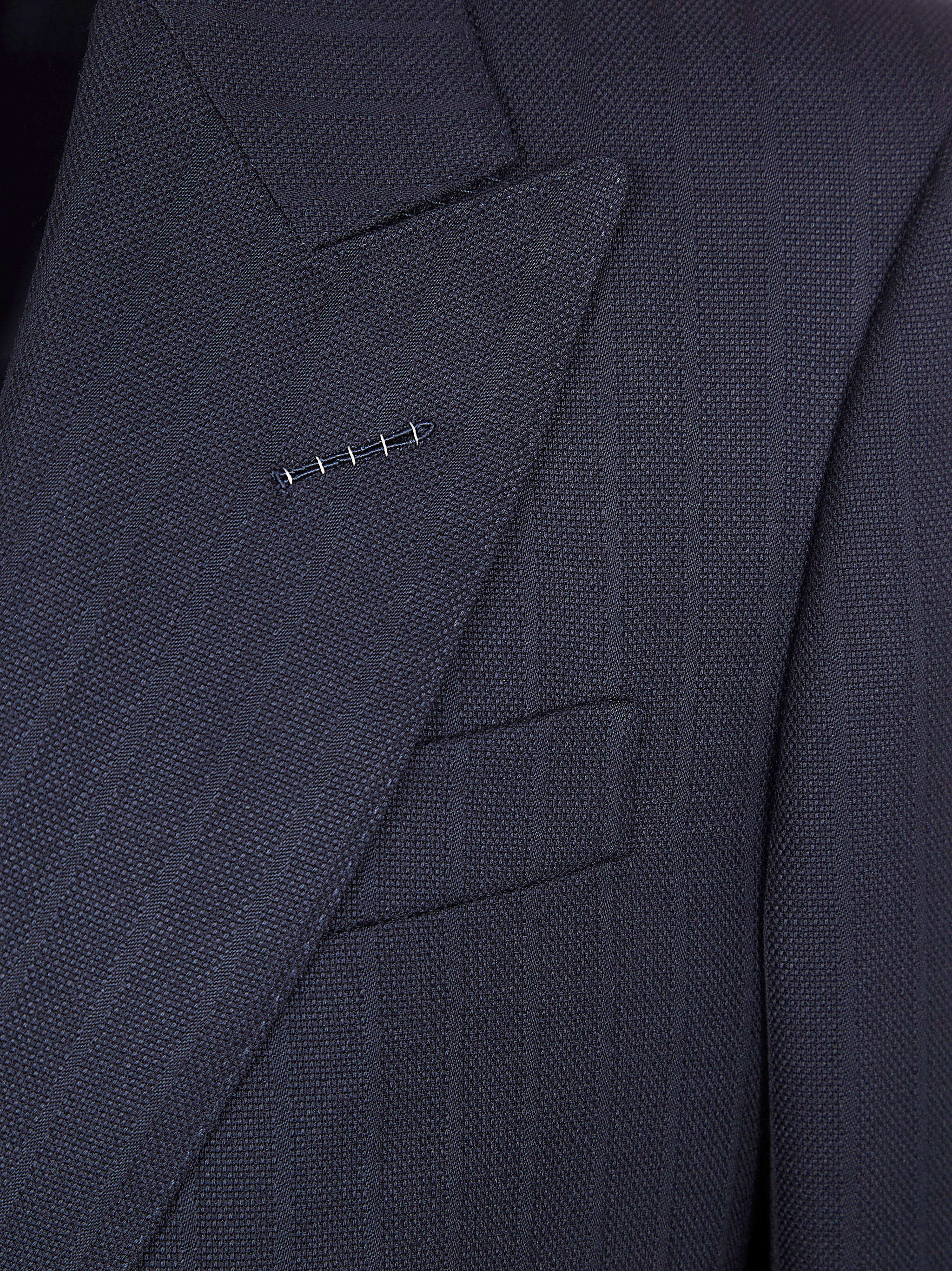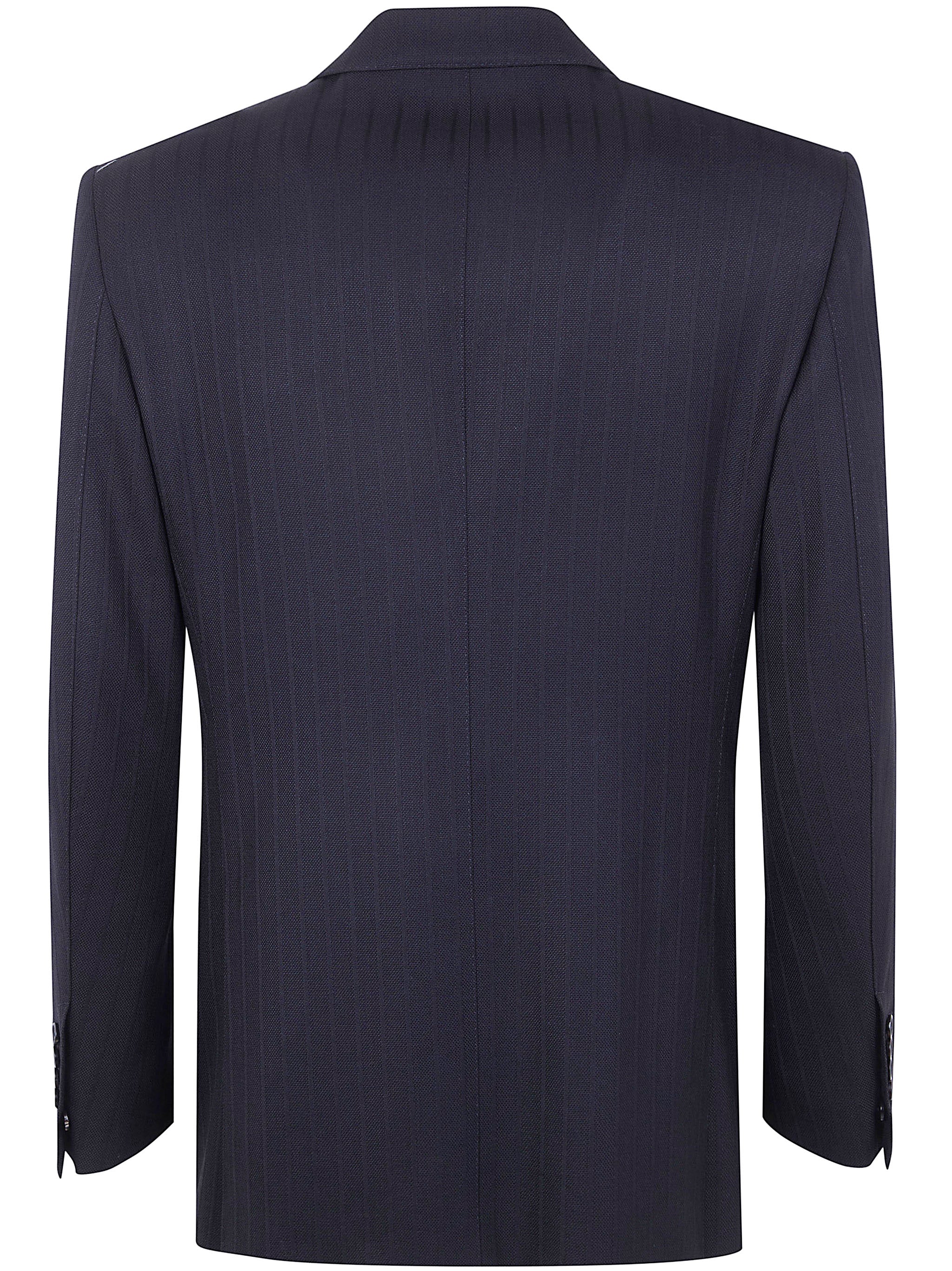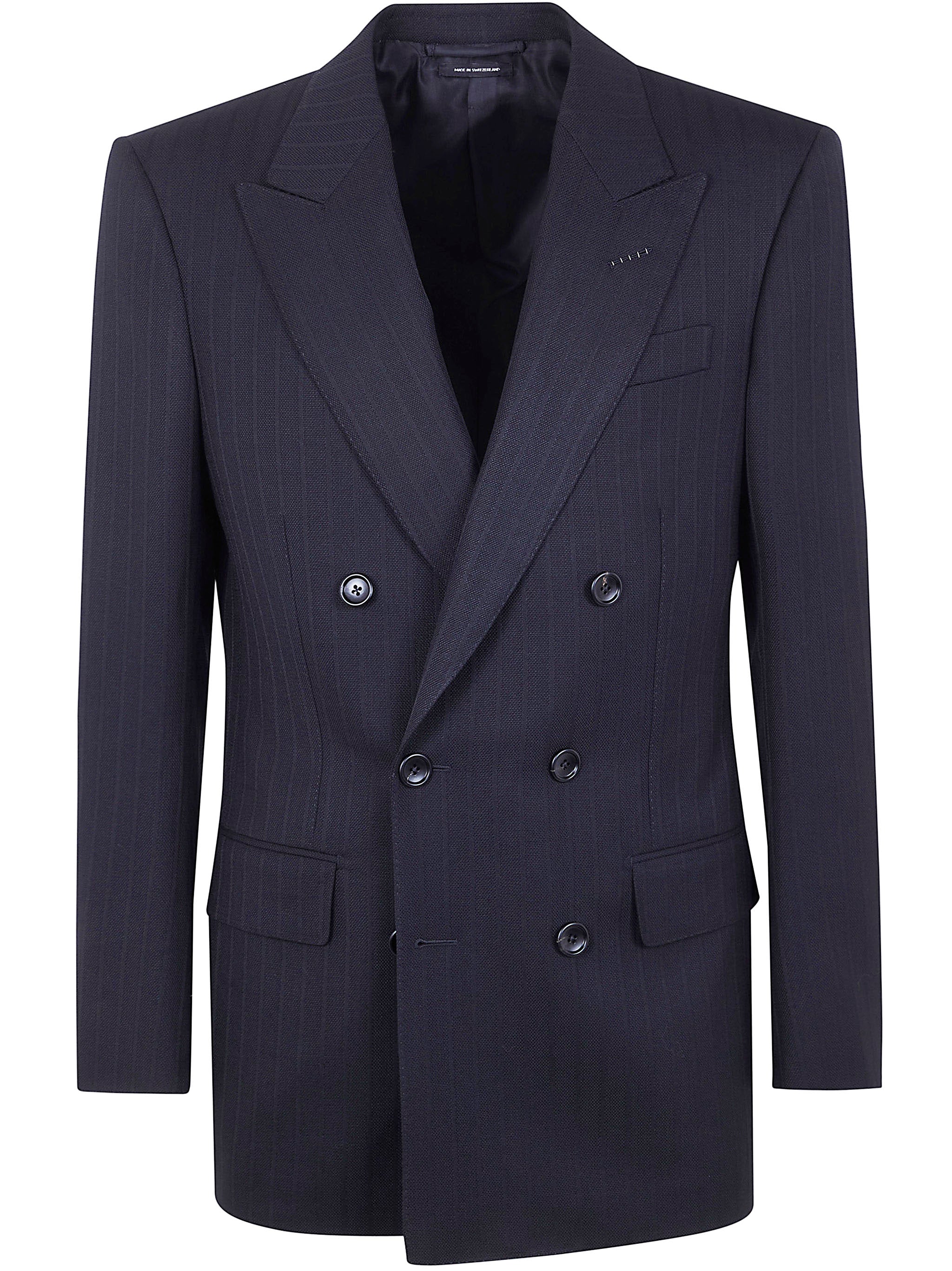 Elevate your formal wardrobe with this impeccably tailored double-breasted jacket from Tom Ford. Crafted from 100% wool with a sophisticated satin stripe pattern, this navy blazer exemplifies refined elegance and timeless style.