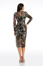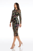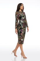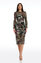 Sophia is a fun and feminine sheath dress, perfect for any occasion. The sheer tulle overlay has colorful floral embroidery. It provides coverage while still showing a glimpse of skin. With a flattering boat neck and figure-hugging silhouette, Sophia will be your new favorite outfit.
