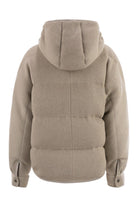 THE AESTHETICS OF THE NEW DOWN JACKET COMBINE THE QUALITY AND SOFTNESS OF CASHMERE KNITWEAR WITH THE PROTECTION AND WARMTH OF GOOSE DOWN AND FEATHER PADDING. THE CLASSIC ENGLISH RIBBED KNIT IS COMBINED WITH THE SLIGHTLY METALLIC EFFECT OF LAMé YARN, WHICH ILLUMINATES THE SURFACE WITH DELICATE, SPARKLING REFLECTIONS. ON THE ZIP PULL, A SPARKLING JEWEL DETAIL, AN ICONIC DECORATION OF THE BRUNELLO CUCINELLI COLLECTIONS, ADDS AN UNMISTAKABLE TOUCH OF FEMININE LIGHT. THE SOFT SPARKLING ENGLISH RIBBED CASHMERE YARN, WOVEN ON A LOOM, COMBINES THE FINE QUALITIES OF NATURAL FIBRE WITH A LAMé THREAD THAT ENRICHES THE TEXTURE WITH DELICATE METALLIC REFLECTIONS. INSIDE, THE SOFT GOOSE DOWN AND FEATHER PADDING COMPLETES THE GARMENT'S COMFORT. ALL GOOSE DOWN PADDING IS SOURCED ONLY FROM EUROPEAN BREEDERS WHO ARE MEMBERS OF THE EDFA (EUROPEAN DOWN AND FEATHER ASSOCIATION), WHICH GUARANTEES RESPECT FOR ANIMALS AND THE ENVIRONMENT. - ZIP CLOSURE WITH DOUBLE SLIDER - HALF LINING IN WATER-REPELLENT NYLON - HOOD - LOW POCKETS - THERMORE® PADDING DESIGNER ID: M01ET7728 CEF37