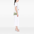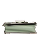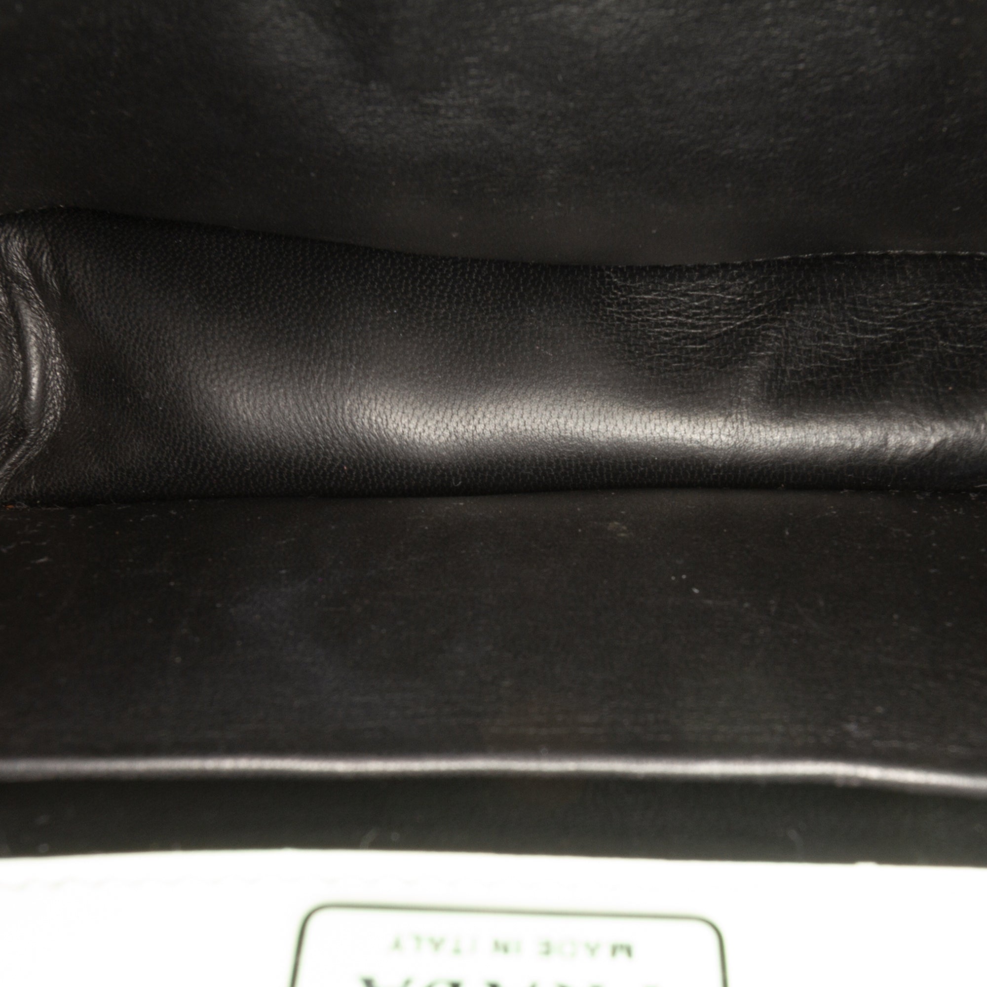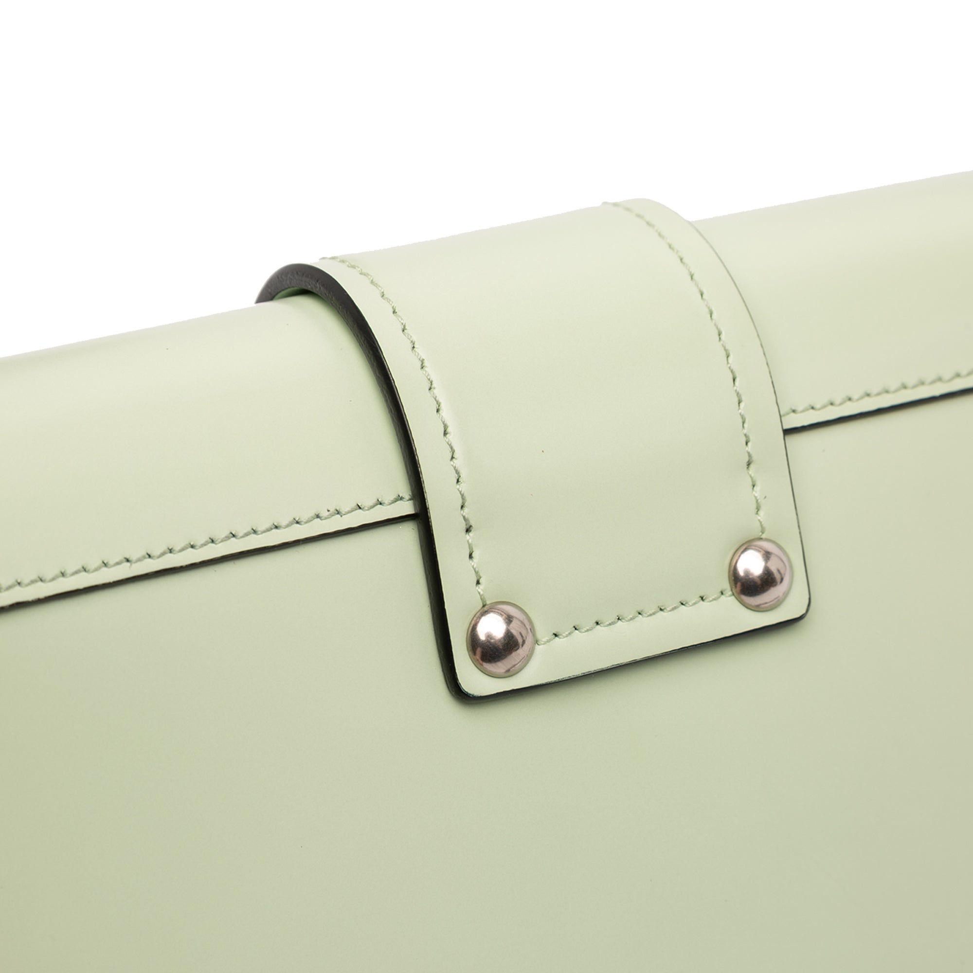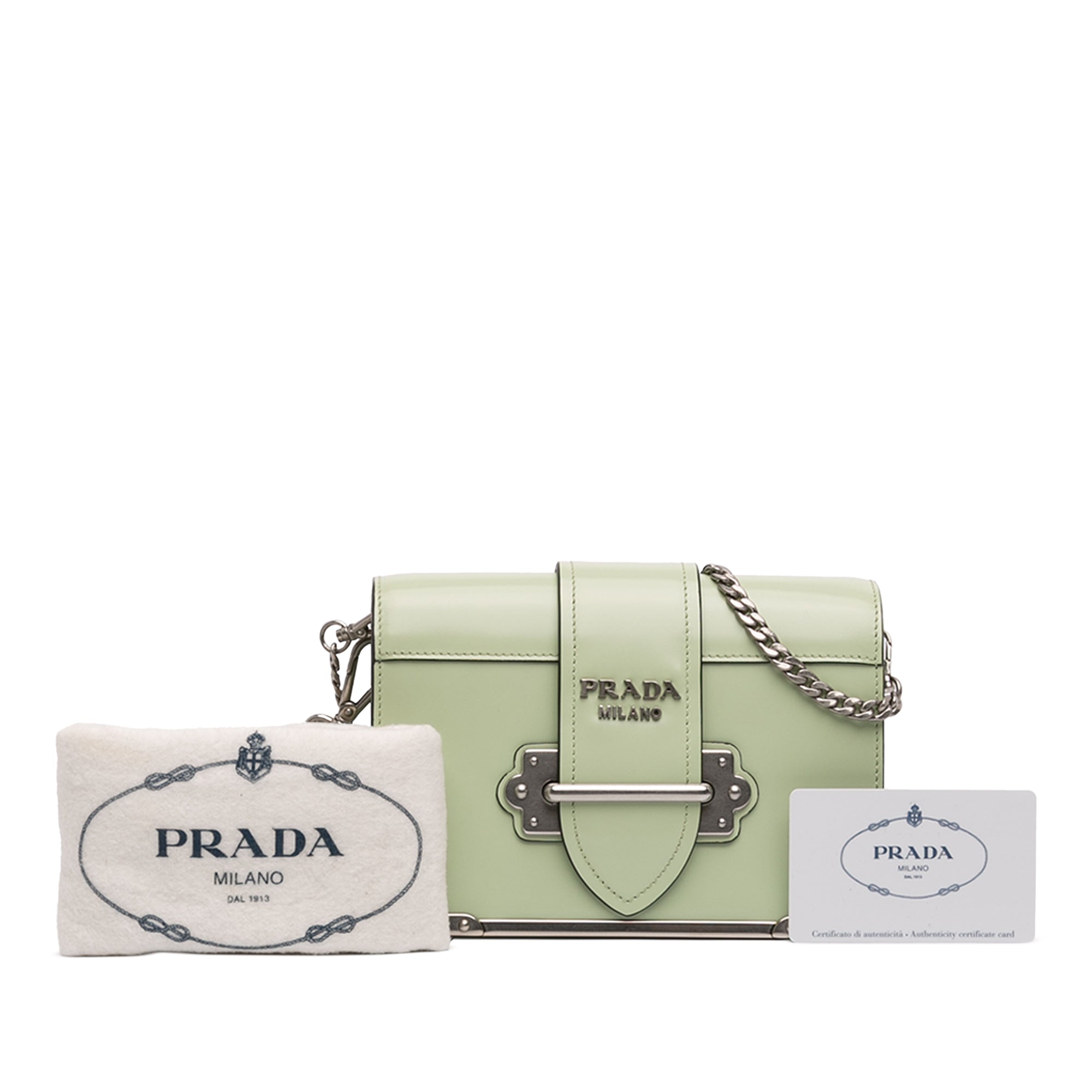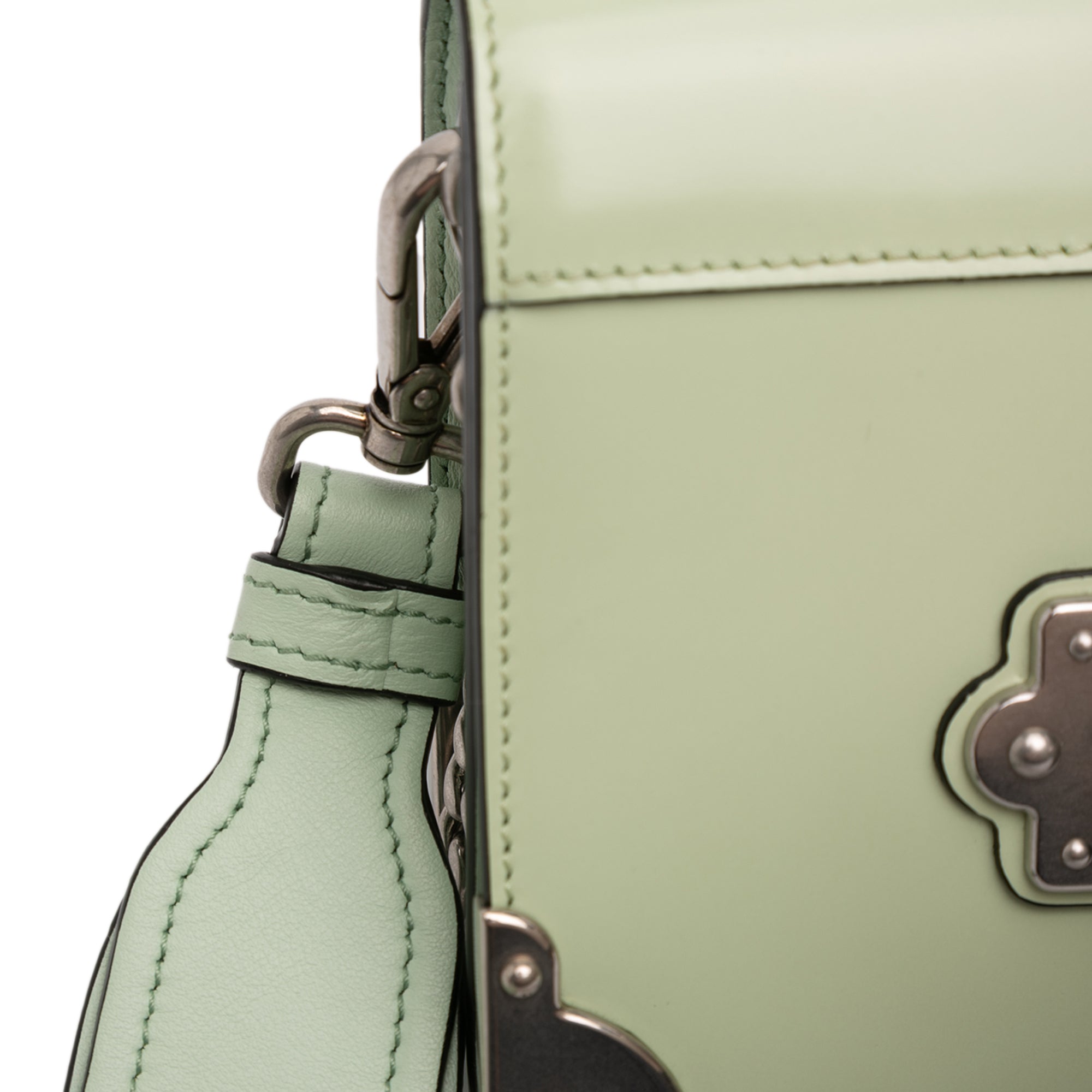The Cahier crossbody bag features a patent leather body, a detachable chain-link shoulder strap, and a front flap with pull-through closure.