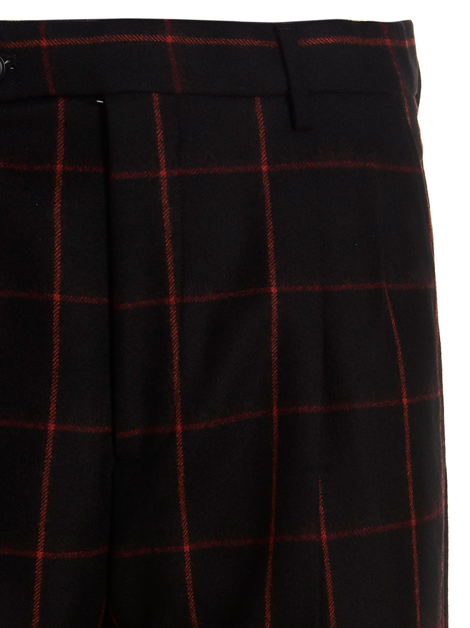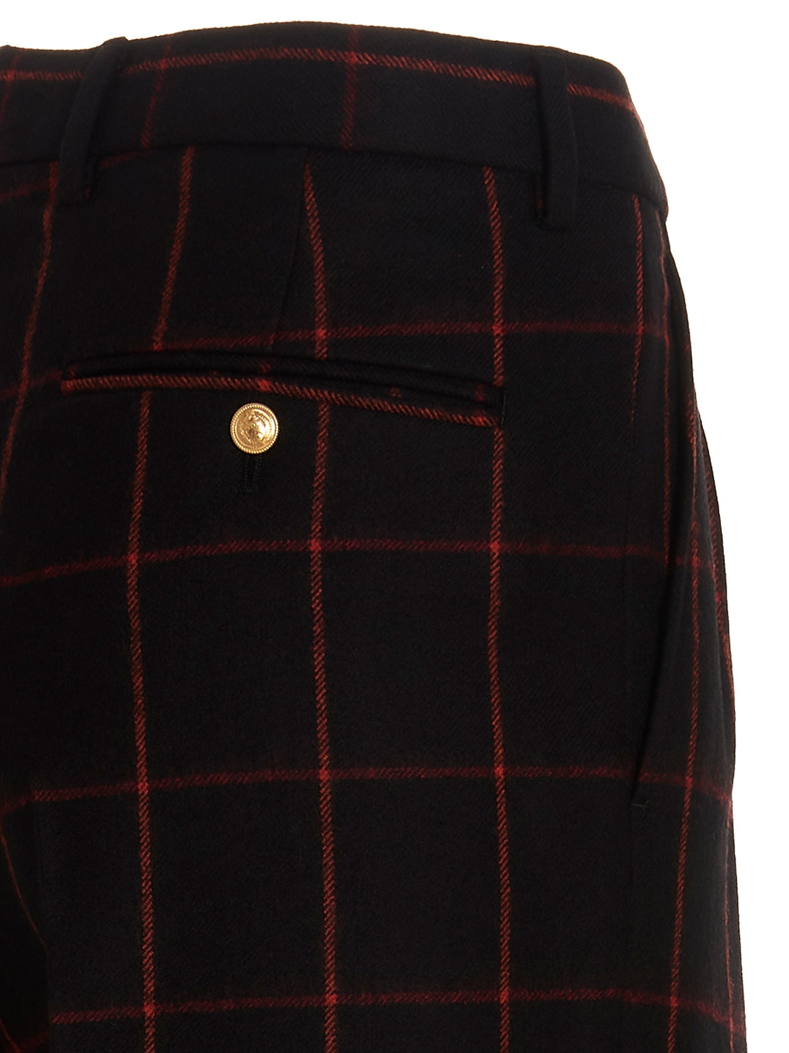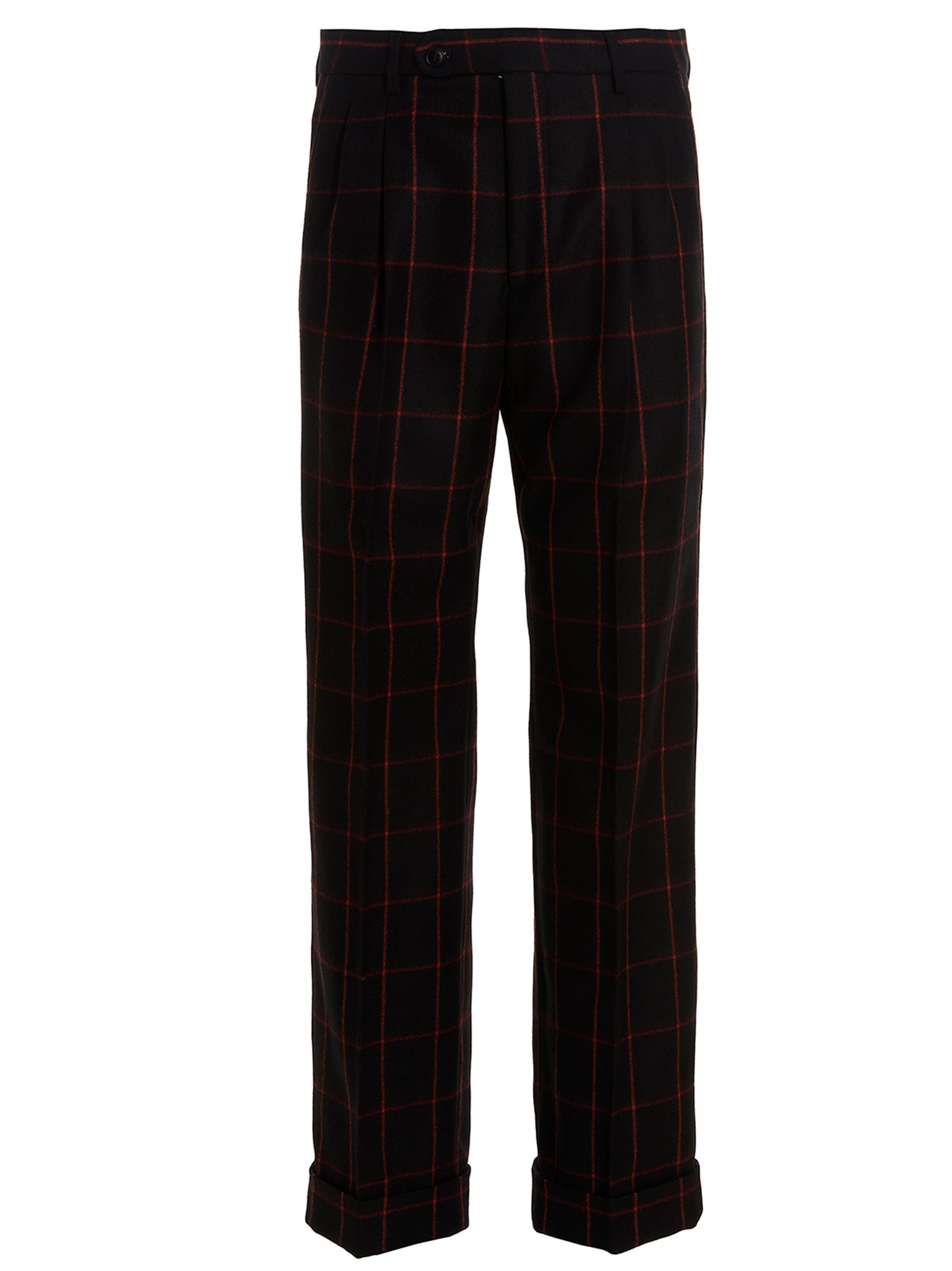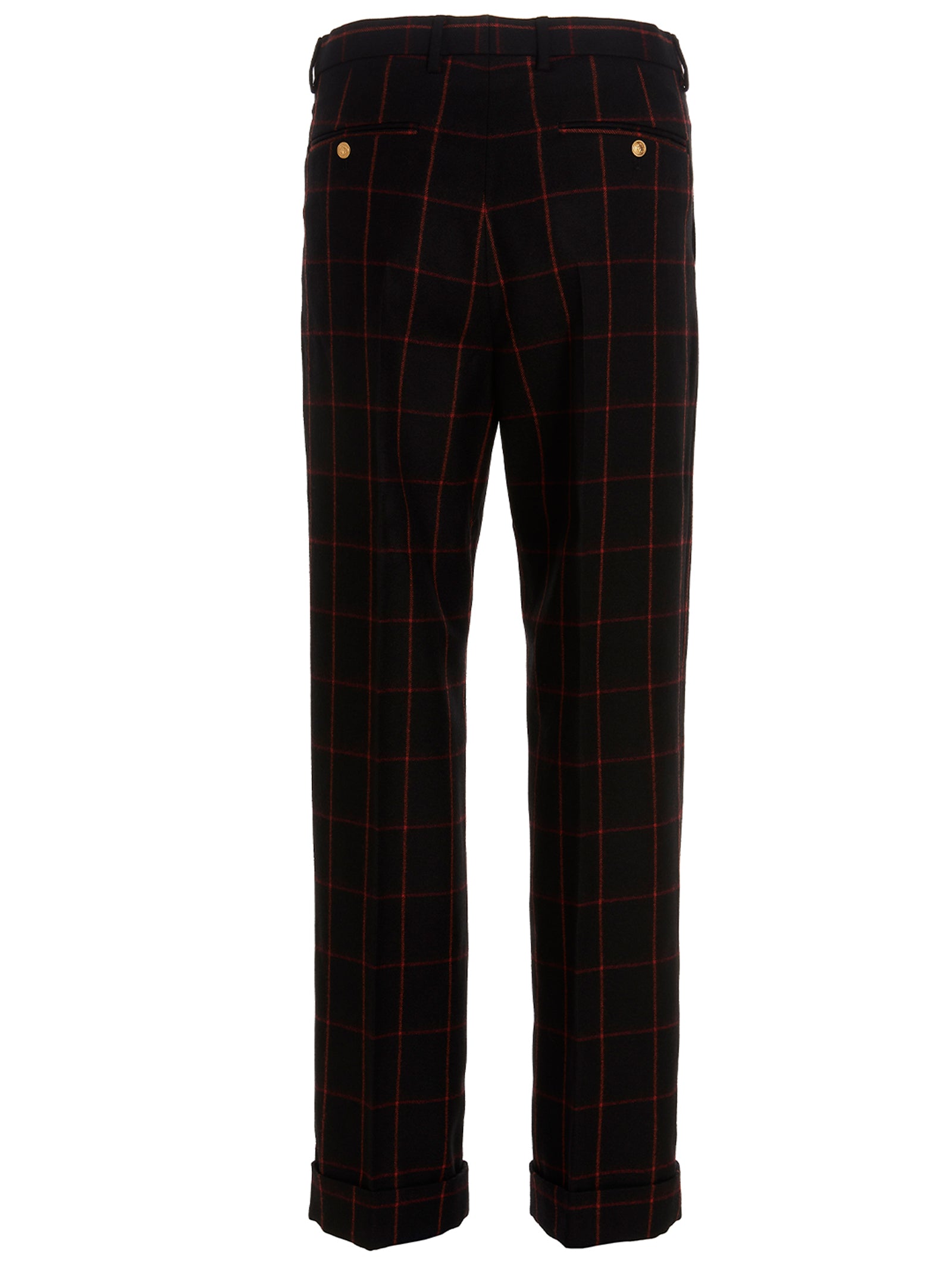 Elevate your tailored wardrobe with these sophisticated Square pants from Gucci. Crafted from luxurious wool, these dress pants feature a striking black and red checked pinstripe pattern that exudes timeless elegance. The refined details include a hook-and-eye zip and button closure, functional pockets, and stylish cuffed hems that add a distinguished finishing touch. Perfect for the office or evening engagements, these pants pair beautifully with crisp dress shirts and blazers for a polished, professional look. The premium wool construction ensures both comfort and durability, making these an essential addition to any discerning gentleman's wardrobe.