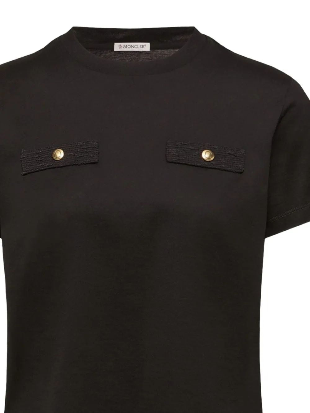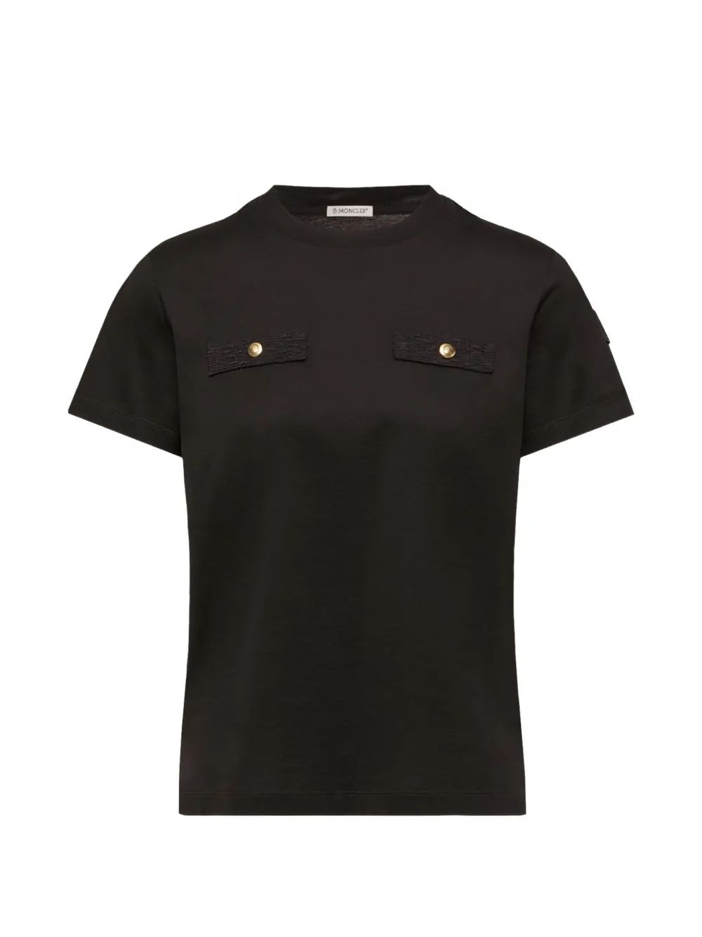 Elevate your everyday wardrobe with this sophisticated short sleeve t-shirt from Moncler. Crafted in a versatile black hue, this elevated essential features distinctive dual chest pockets accented with polished gold-tone button details that add a touch of luxury to a classic silhouette.