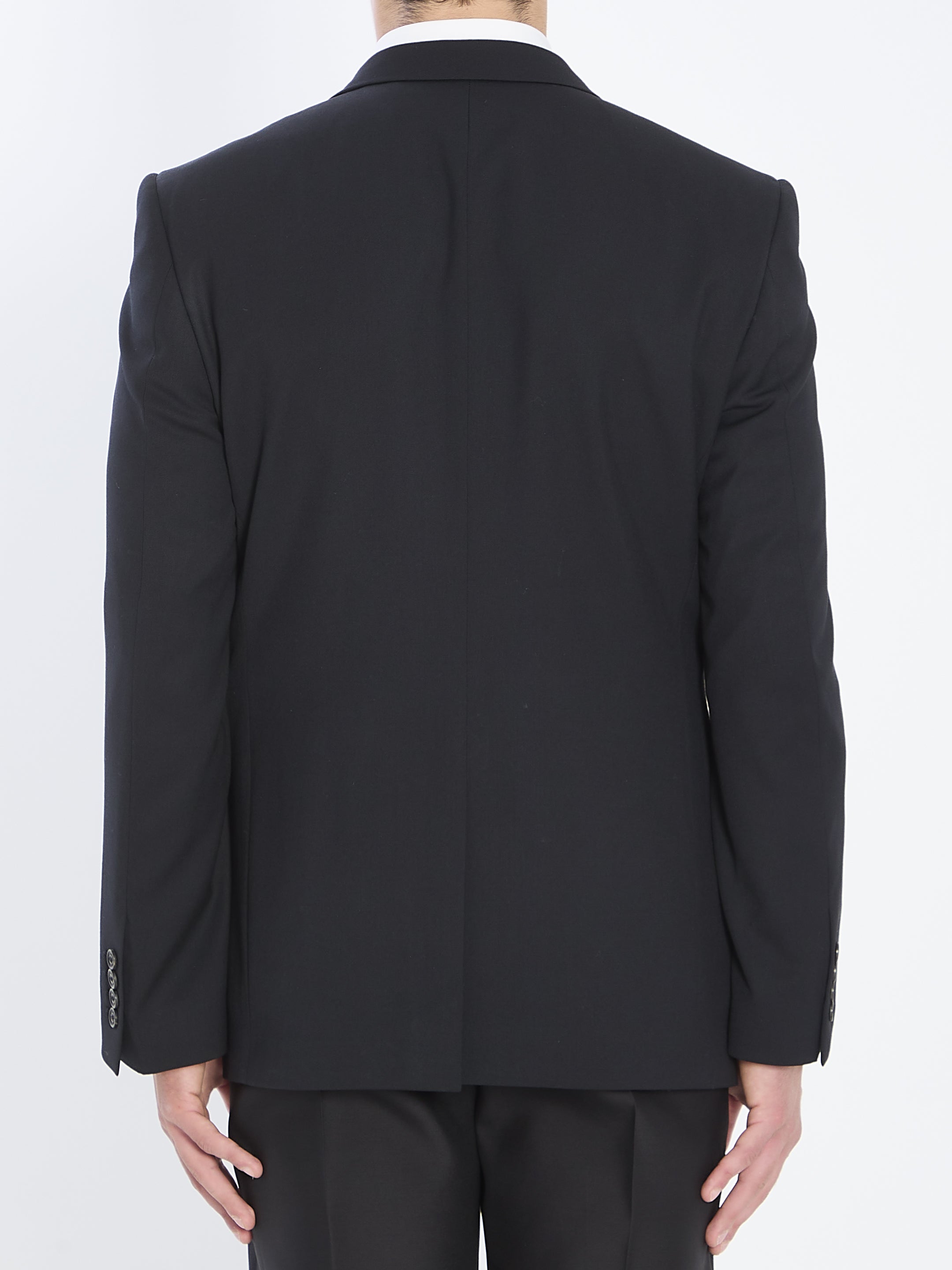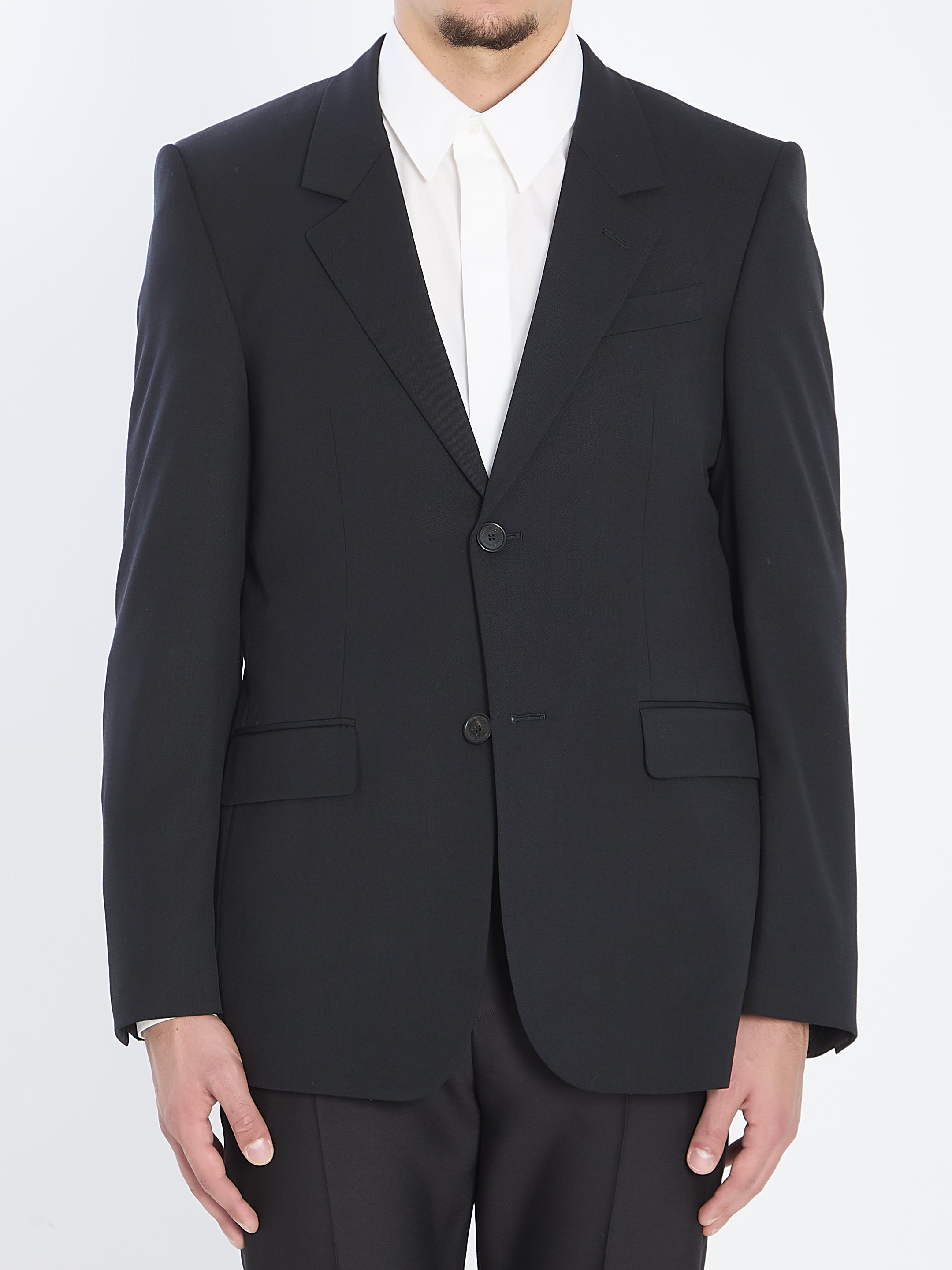 Tailored jacket in black wool. Features peak lapels, single-breasted front closure, long sleeves with buttoned cuffs, two flap pockets on the front, a welt chest pocket, and a single back vent. Fully lined in custom cupro. Regular fit.