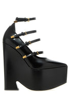 The multiple adjustable straps adorned with signature V-shaped metal details add an edgy, modern touch while ensuring a secure fit. The substantial platform and heel combination provides both height and comfort, making these the perfect choice for evening events, cocktail parties, or any occasion where you want to make an unforgettable entrance.