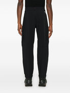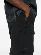 BLACK REAR ELASTICATED WAISTBAND WAIST TABS TAPED SEAMS FRONT ZIP FASTENING POCKETS TWO SIDE CARGO POCKETS LOGO LETTERING TAPERED LEG ELASTICATED ANKLES FRONT PRESS-STUD AND ZIP FASTENING