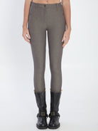 Taupe stretch cotton trousers with a subtle herringbone pattern. Feature an elasticated waistband, hook and zip closure, belt loops with Equestrian Knight Design label detail, snap buttons at the hem, and faux front pockets.