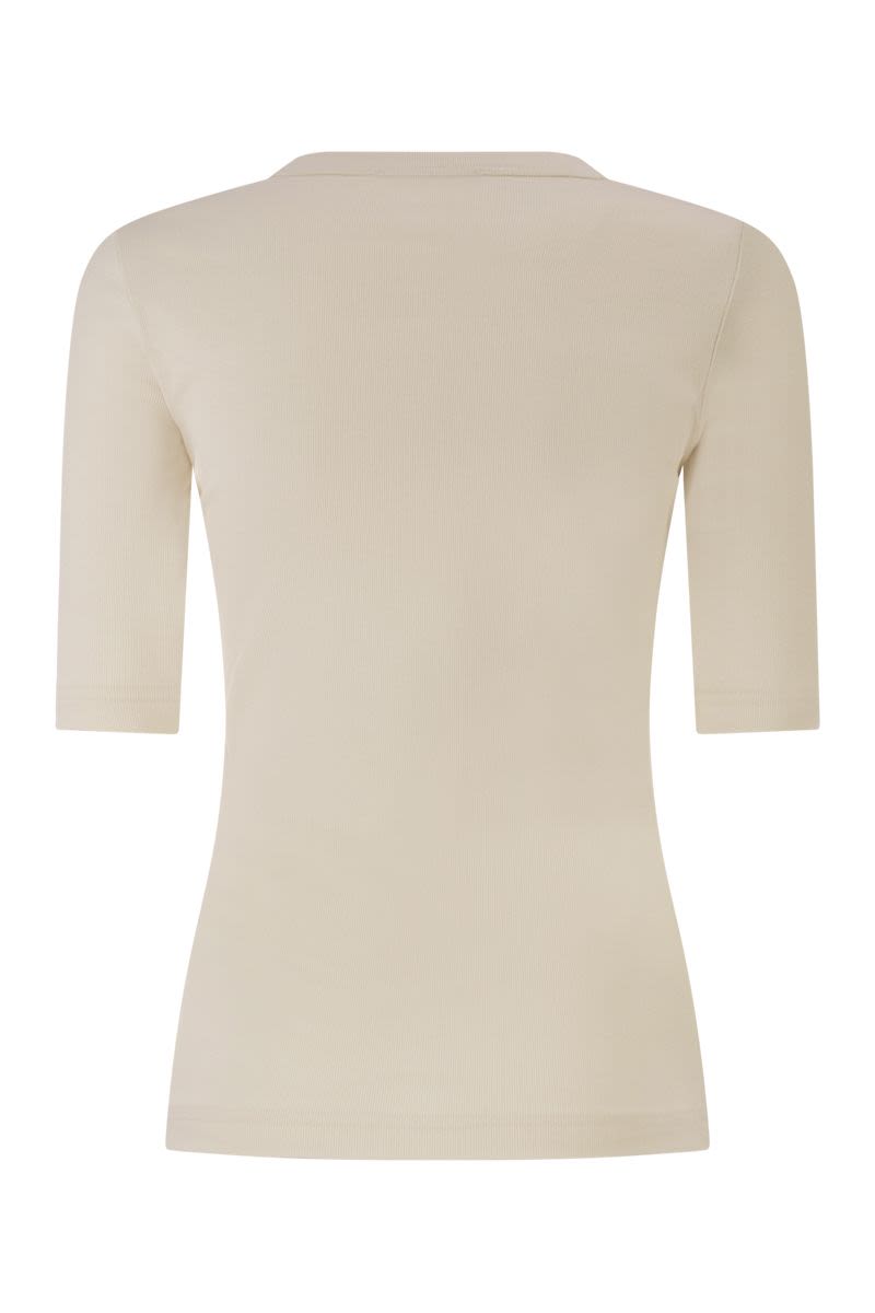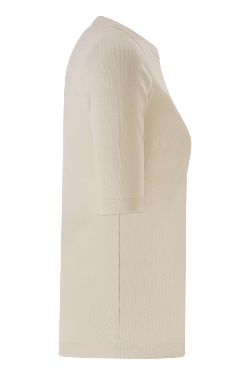 THIS CREW NECK T-SHIRT ELEVATES AN EVERYDAY WARDROBE STAPLE THROUGH THE USE OF HIGH-QUALITY MATERIALS AND DISTINCTIVE DETAILS. CRAFTED FROM SOFT STRETCH COTTON JERSEY, THE KNIT ENSURES A COMFORTABLE AND IMPECCABLE FIT. THE DESIGN IS EMBELLISHED WITH A REFINED COTTON POPLIN PATCH POCKET ON THE CHEST, FINISHED WITH A TULLE INSERT AND DELICATE EMBROIDERY IN SEQUINS OR MICRO SEQUINS THAT ADDS A SUBTLE TOUCH OF SPARKLE. A VERSATILE GARMENT THAT COMBINES THE PRACTICALITY OF SPORTSWEAR WITH THE SARTORIAL ELEGANCE OF MADE IN ITALY. - STRETCH COTTON JERSEY - CONTRASTING COTTON POPLIN PATCH POCKET - PRECIOUS EMBROIDERED INSERT ON THE POCKET - CLASSIC CREW NECK AND ELBOW-LENGTH SLEEVES - CLEAN LINES AND FITTED FIT - MADE IN ITALY USING SUSTAINABLE PROCESSES DESIGNER ID: JED266F148L933 0145