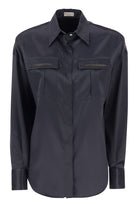 FEMININE AND ELEGANT, THE STRETCH SILK SATIN SHIRT IS ENRICHED WITH THE ICONIC DETAILS OF THE BRUNELLO CUCINELLI COLLECTIONS. THE CHARACTERISTIC FLUID AND IRIDESCENT TEXTURE OF THE FABRIC ACCOMPANIES THE SOFT LINES OF THE GARMENT, MAKING IT PARTICULARLY COMFORTABLE TO WEAR. A BRILLIANT EMBROIDERY IN THIN ROWS OF JEWELS ILLUMINATES THE FLAP OF THE POCKETS WITH A PRECIOUS TOUCH. AN ELEGANT FABRIC WITH A SHINY EFFECT AND A FLOWING HAND, STRETCH SILK SATIN IS A CLASSIC AMONG BRUNELLO CUCINELLI'S FINE MATERIALS. A SMALL PERCENTAGE OF SYNTHETIC FIBRE ENHANCES WEARING COMFORT. - CONCEALED BUTTON FASTENING - CLASSIC COLLAR - TWO PATCH POCKETS WITH FLAP ON CHEST - DROPPED SHOULDER - CUFFS WITH ONE MOTHER-OF-PEARL BUTTON - NICKEL-FREE JEWELLERY DECORATION DESIGNER ID: MPC59MV816 C8901