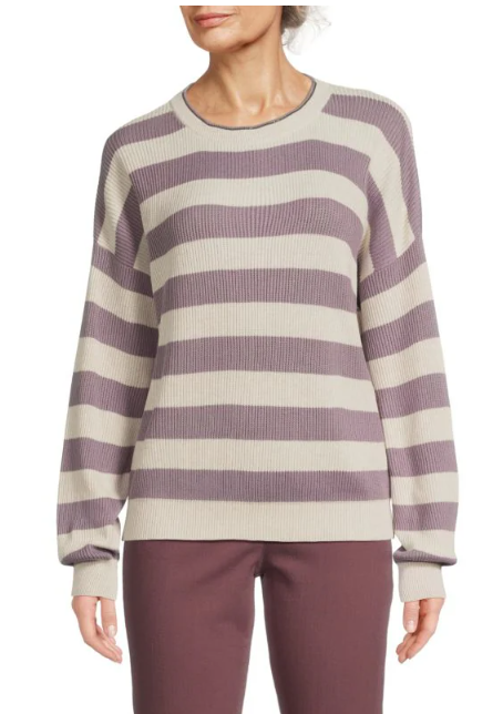 Brunello Cucinelli's striped cotton sweater epitomizes effortless elegance with its relaxed silhouette and timeless design. The crewneck and dropped shoulders create a contemporary ease, while bold horizontal stripes deliver understated visual interest. Crafted from pure cotton, this pullover features rib-knit cuffs and hem for refined finishing touches. An essential layering piece that transitions seamlessly from casual to polished occasions.