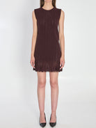 BORDEAUX WOVEN TERRY DRESS FEATURING AN A-LINE SILHOUETTE, SLEEVELESS DESIGN, VERTICAL STRIPES, CREW NECKLINE, AND THIGH-LENGTH CUT. FITTED AT THE TOP WITH A FLARED SHAPE.