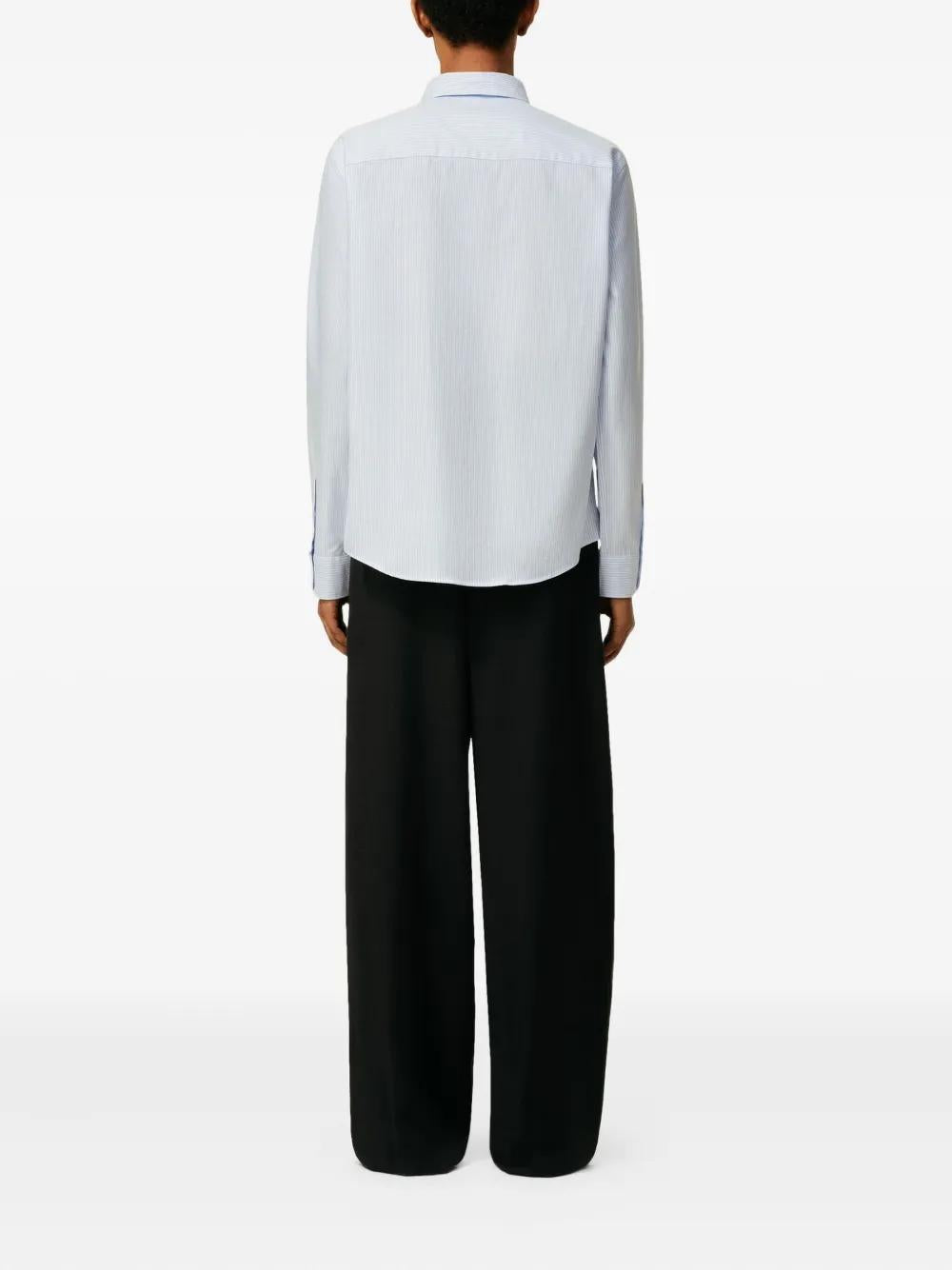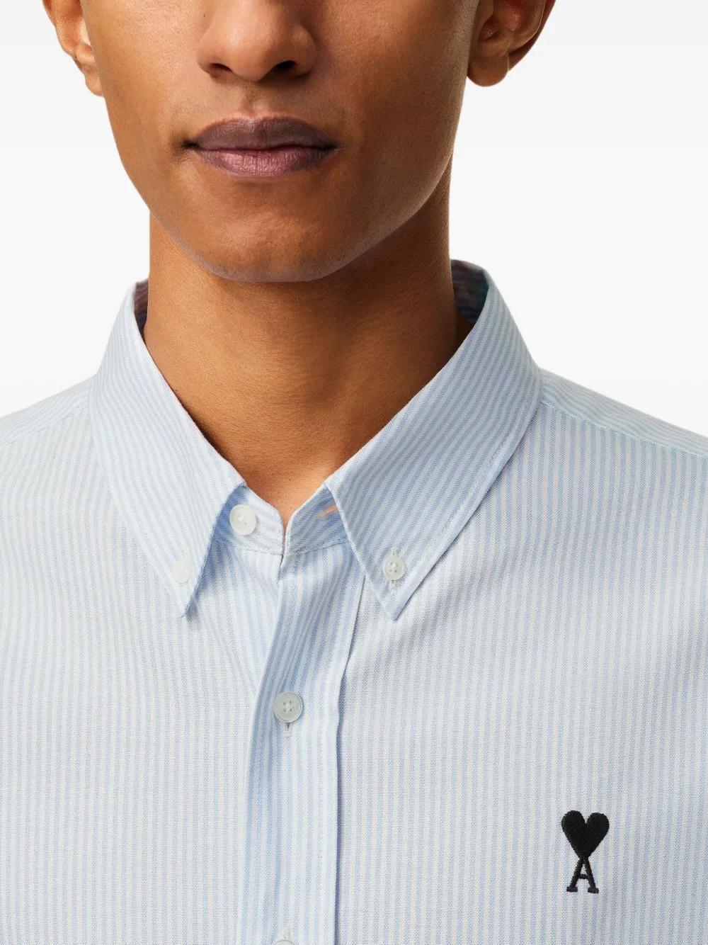 BLUE AND LIGHT BLUE STRIPED BUTTON-UP SHIRT BY AMI PARIS. FEATURES STRIPE PATTERN, BUTTON FASTENING, AND EMBROIDERED LOGO DETAIL. LONG-SLEEVED SHIRT FOR MEN.