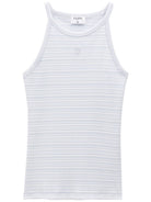 BLUE-GREY/CHALK WHITE ORGANIC COTTON FINE RIBBED HORIZONTAL STRIPE PRINT EMBROIDERED MONOGRAM TO THE FRONT HALTERNECK SLEEVELESS RACERBACK STRAIGHT HEM THIS ITEM IS MADE FROM AT LEAST 50% ORGANIC MATERIALS. LEARN MORE ABOUT WHAT MAKES A PRODUCT CONSCIOUS ON OUR CONSCIOUS CRITERIA PAGE