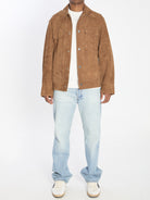 JACKET IN HAZELNUT BROWN SUEDE GOAT LEATHER. FEATURING A POINTED COLLAR, FRONT SNAP-BUTTON CLOSURE, TWO VERTICAL FLAP POCKETS ON THE CHEST, TWO FRONT WELT POCKETS, SNAP BUTTONS ON THE CUFFS AND HEM, AND SUEDE LOGO PATCH APPLIED ON THE BACK. REGULAR FIT.