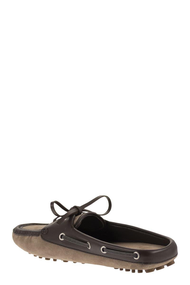 THE NAUTICAL INSPIRATION IS ELEVATED TO A DIMENSION OF PURE ARTISANAL LUXURY THROUGH THIS SABOT MOCCASIN BY BRUNELLO CUCINELLI. THE STAR OF THE SHOW IS THE FINE SUEDE, A COMPACT LEATHER WITH A SOFT, VELVETY TEXTURE THAT ENVELOPS THE FOOT WITH EXTREME SOFTNESS. THE DESIGN, CHARACTERISED BY AN OPEN HEEL, COMBINES THE PRACTICALITY OF A SLIDE WITH THE CLASSIC ELEGANCE OF A BOAT SHOE, EMPHASISED BY LEATHER LACES AND METAL LOOPS. AN ICONIC TOUCH OF LIGHT EMBELLISHES THE SHOE: A THIN METAL INSERT IS DELICATELY SET ALONG THE SIDE PROFILE, REFLECTING THE ATTENTION TO DETAIL AND DISCREET ELEGANCE TYPICAL OF SOLOMEO. THE “DRIVER” SOLE WITH ITS CHARACTERISTIC RUBBER STUDS ENSURES FLEXIBILITY AND PROLONGED COMFORT, MAKING THIS MODEL PERFECT FOR THE MOST REFINED LEISURE TIME. - UPPER IN FINE SUEDE WITH A VELVETY, COMPACT FEEL - METAL DETAIL APPLIED TO THE SIDE - SABOT DESIGN WITH OPEN HEEL - MATCHING LEATHER LACES - SUEDE INNER LINING - INTEGRATED RUBBER SOLE DESIGNER ID: MZSFG3202 C8849 SOLE HEIGHT: 2.5 CM