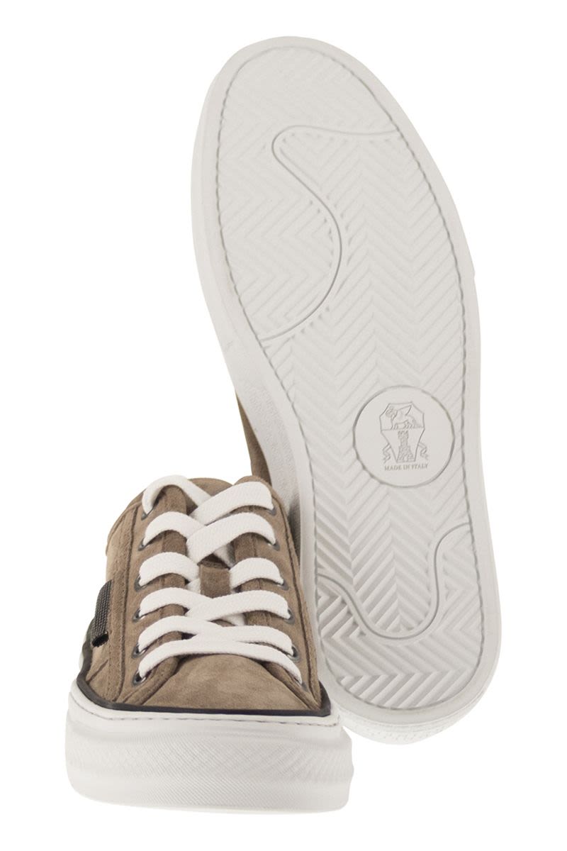 FINE MATERIALS AND PRECIOUS DETAILS ELEVATE THE SPORTY STYLE OF THESE SUEDE SNEAKERS. THE SOFT, VELVETY TOUCH OF THE LEATHER HIGHLIGHTS THE DELICATE SEASONAL SHADES AND ENHANCES THE RELAXED SILHOUETTE, COMPLETED BY CLASSIC CRISS-CROSS LACES. THE EMBROIDERED TAG IN SHINY METAL ADDS A TOUCH OF LIGHT, IN PURE BRUNELLO CUCINELLI STYLE. THE FINE SUEDE IS A COMPACT LEATHER WITH A SOFT, VELVETY TEXTURE. - FLAT FABRIC LACES - LEATHER LINING - LIGHTWEIGHT RUBBER SOLE - NICKEL-FREE METAL DECORATION - 3 CM HEEL DESIGNER ID: MZSFG3221 C8849 SOLE HEIGHT: 3 CM