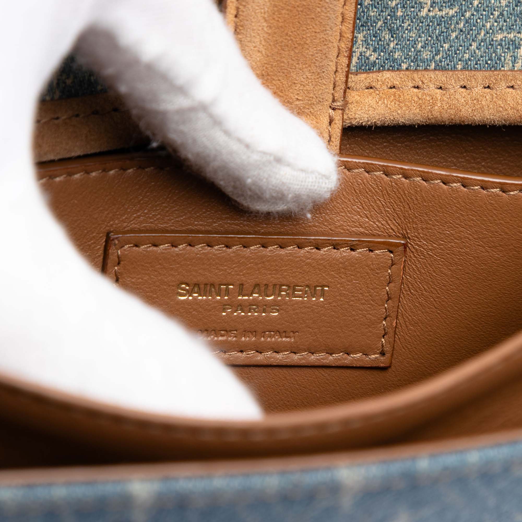 This crossbody bag features a denim body with suede leather trim, an adjustable flat strap, a top flap with magnetic closure, and an interior slip pocket.