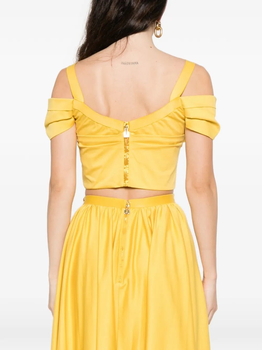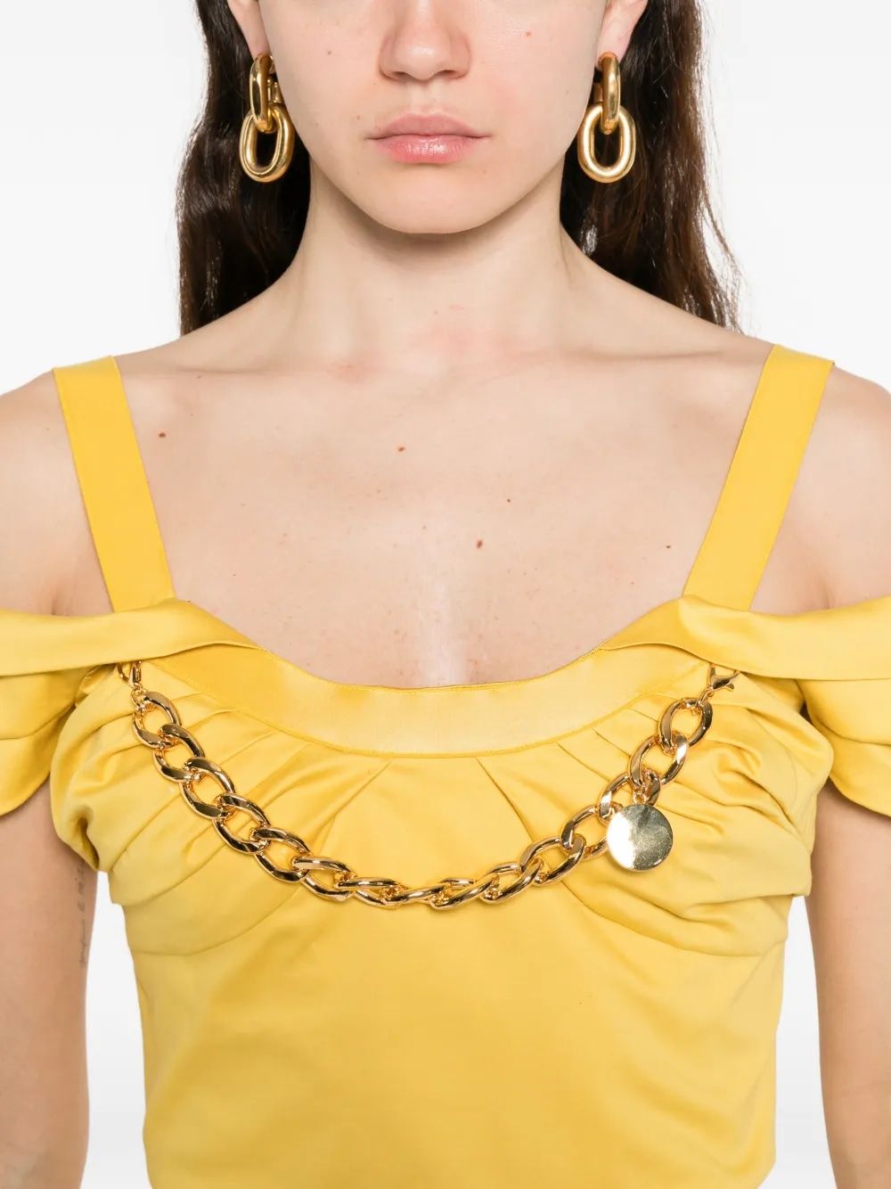 Elevate your warm-weather wardrobe with this stunning SUN COTTON TOP from Elisabetta Franchi. This vibrant yellow crop top features an eye-catching off-shoulder design with elegant draped detailing and a sophisticated chain accent across the bust.