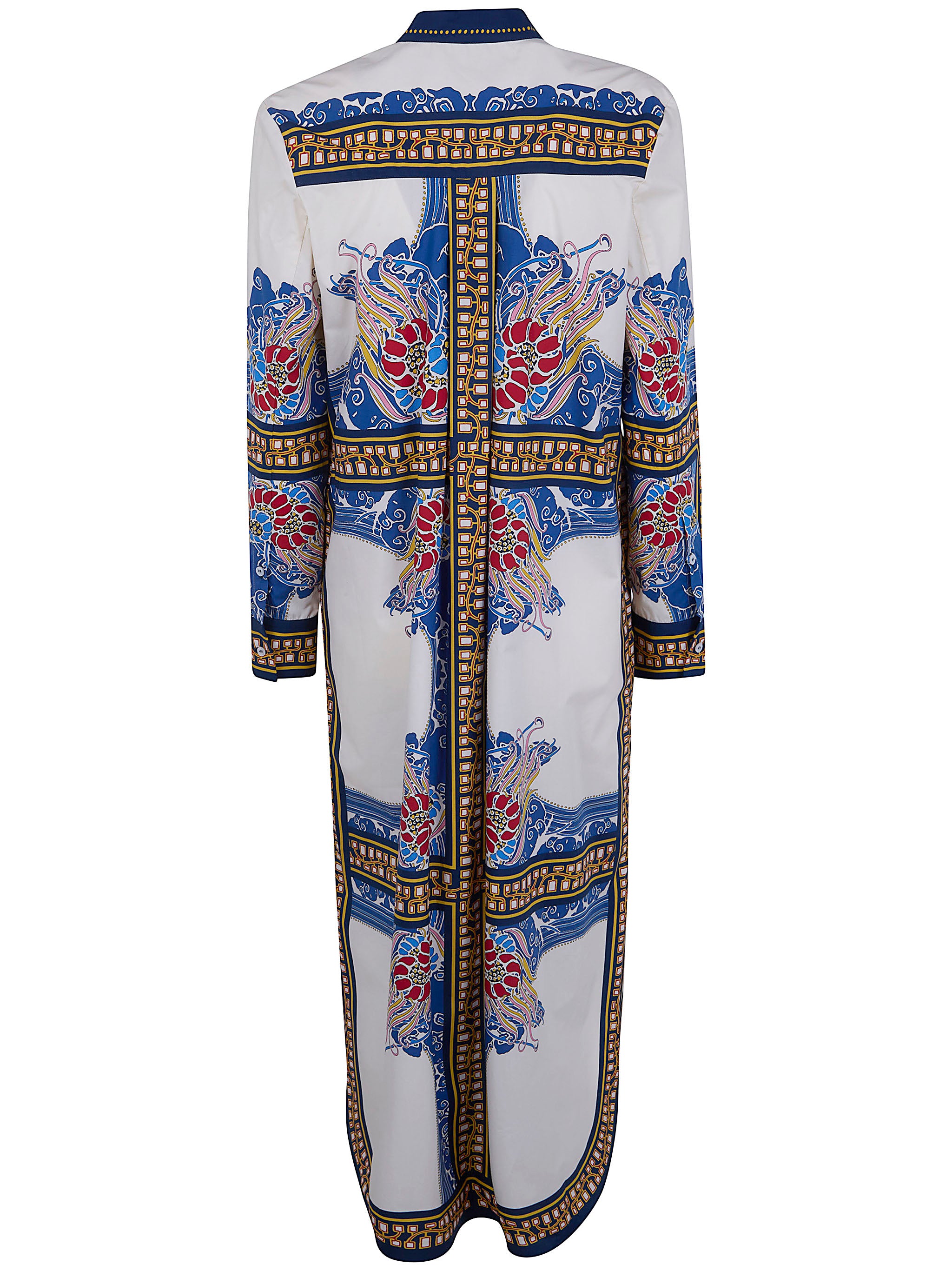 This luxurious tunic features an ornate blue and red floral pattern with gold embellished trim details on a crisp white cotton base, creating a striking visual impact. The midi-length silhouette with long sleeves and classic shirt collar offers both elegance and comfort.