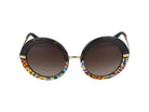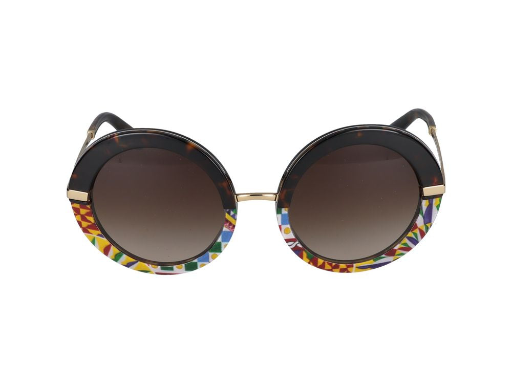 Make a bold statement with these stunning Dolce & Gabbana round sunglasses featuring a unique multicolored decorative pattern along the lower rim. The gradient brown lenses provide excellent UV protection while maintaining a sophisticated aesthetic.