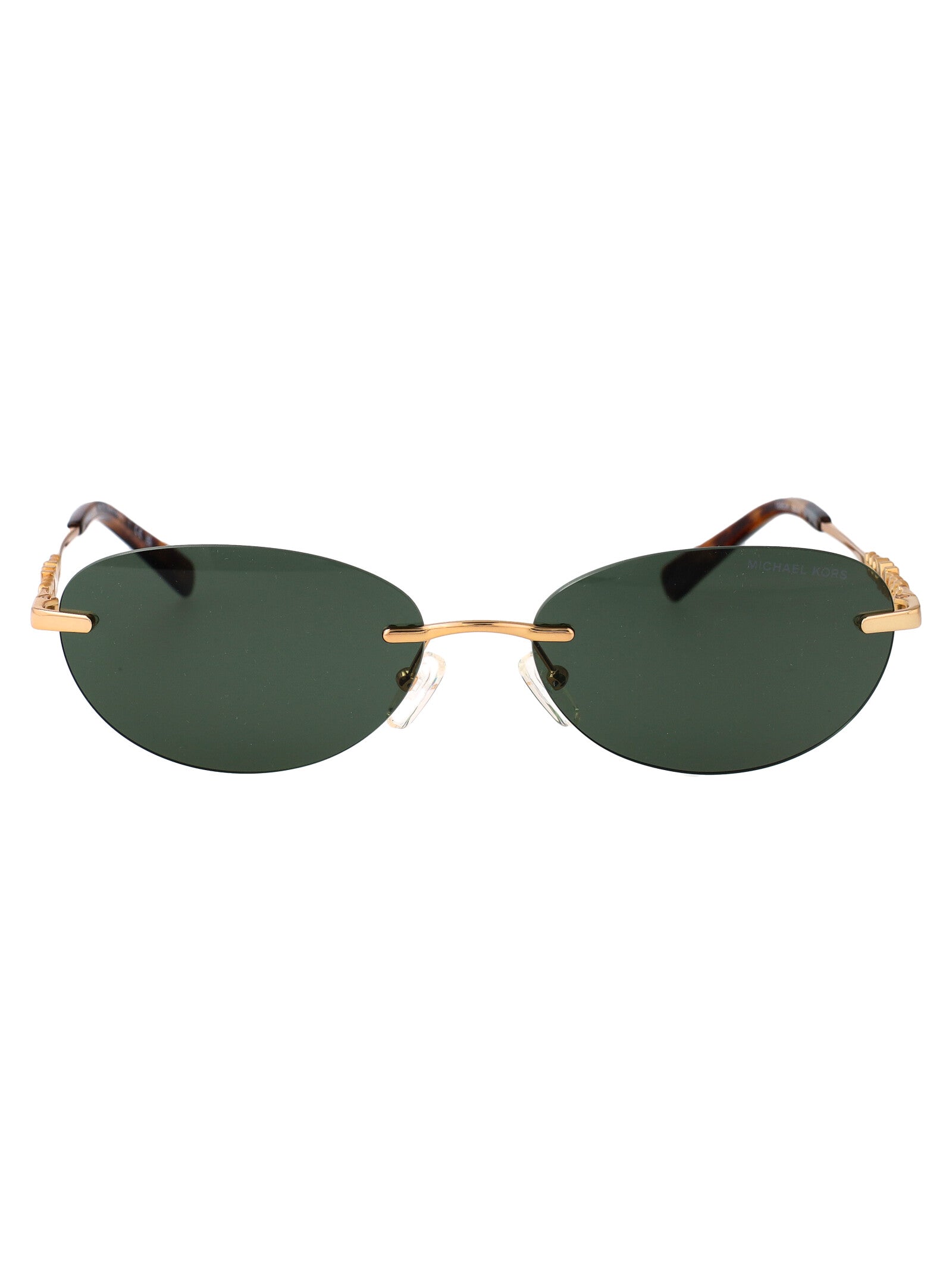 Elevate your everyday style with these stunning Michael Kors rimless sunglasses. Featuring a sophisticated rose gold-tone frame and rich dark green lenses, these sunglasses offer both timeless elegance and superior sun protection.