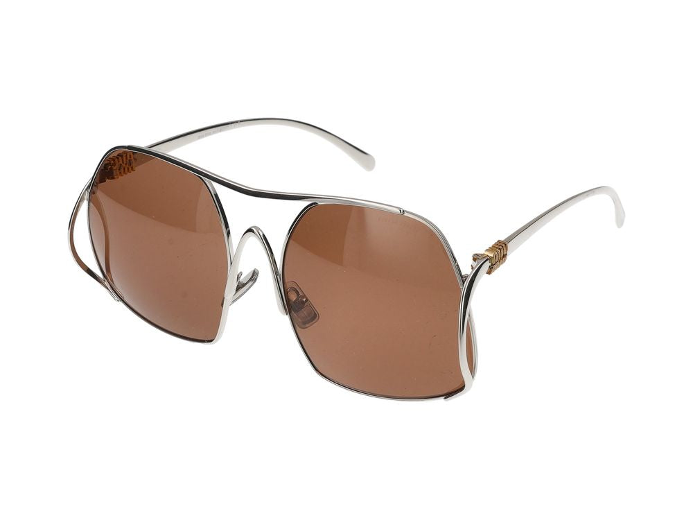 Elevate your eyewear collection with these stunning Miu Miu sunglasses featuring an oversized square silhouette and luxurious bronze-tinted lenses. The sleek metal frame is accented with distinctive temple details that showcase the brand's signature sophisticated aesthetic.