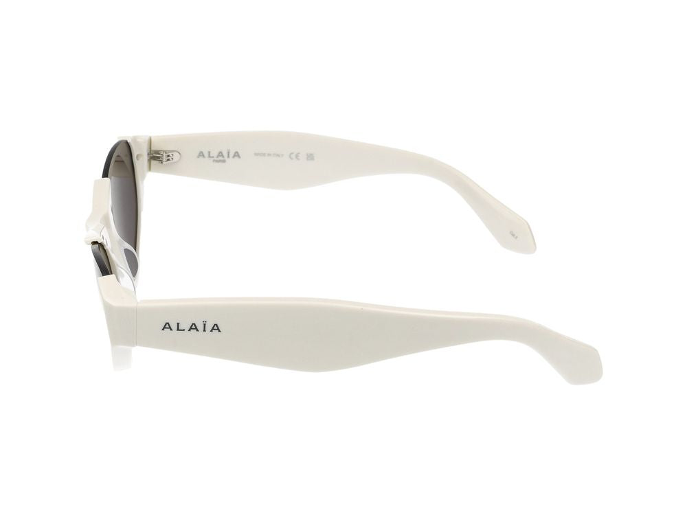 Make a statement with these stunning white sunglasses from Alaïa. Featuring a sleek cat-eye silhouette with dark grey lenses, these designer shades offer both sophisticated style and UV protection.