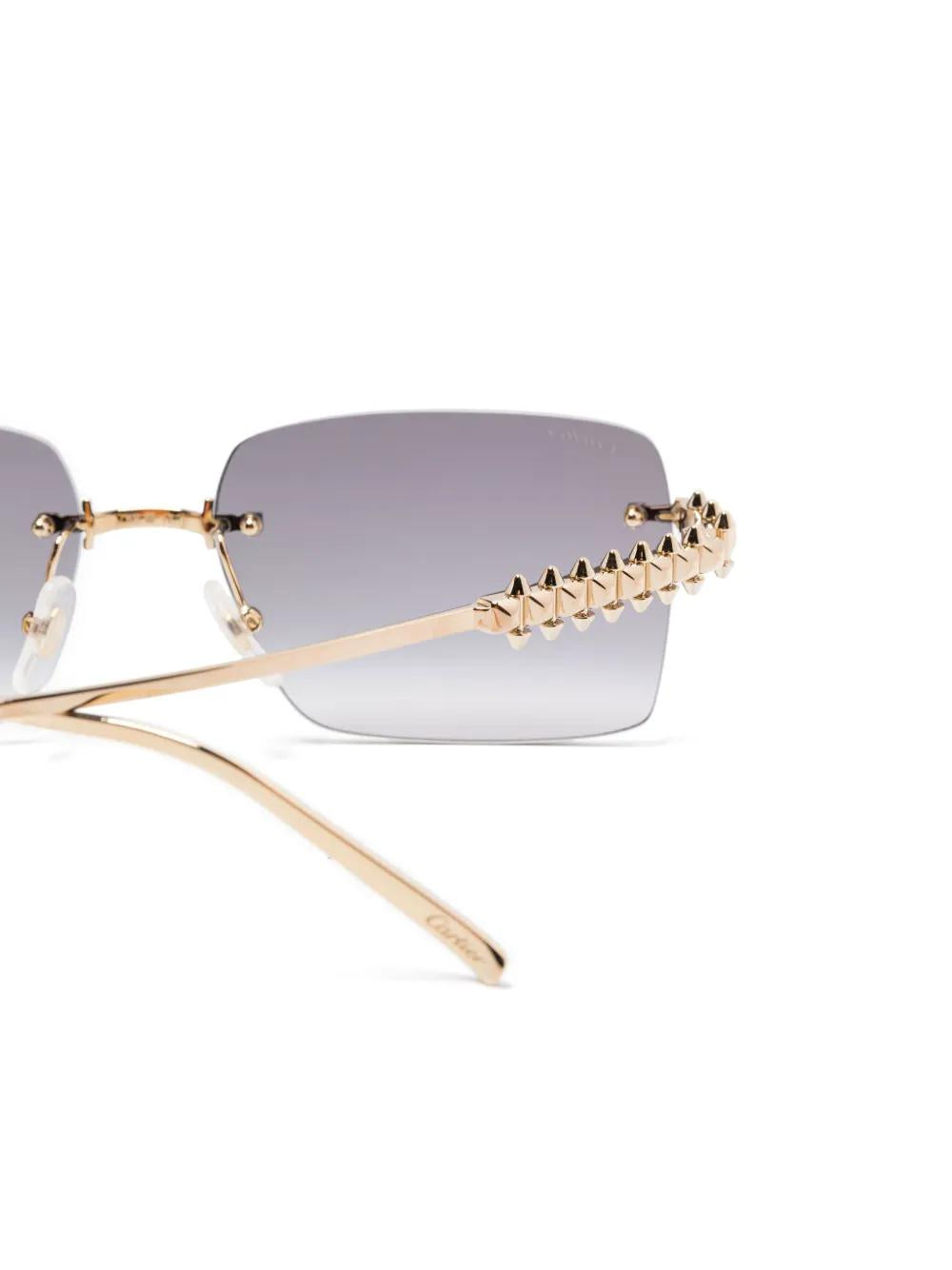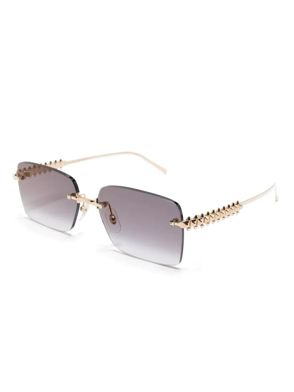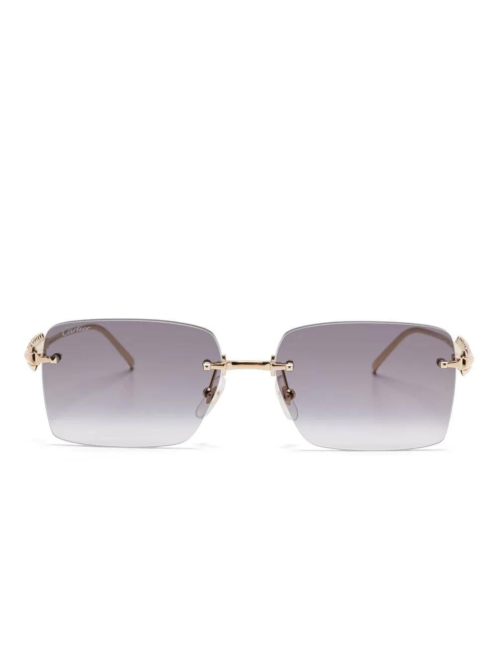 Elevate your eyewear collection with these exquisite Cartier CT0545S sunglasses in luxurious gold with gradient grey lenses. These sophisticated rimless frames feature delicate gold-tone hardware and temples, embodying Cartier's signature blend of elegance and craftsmanship.