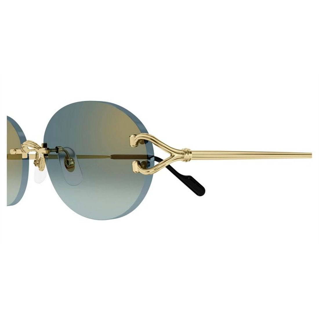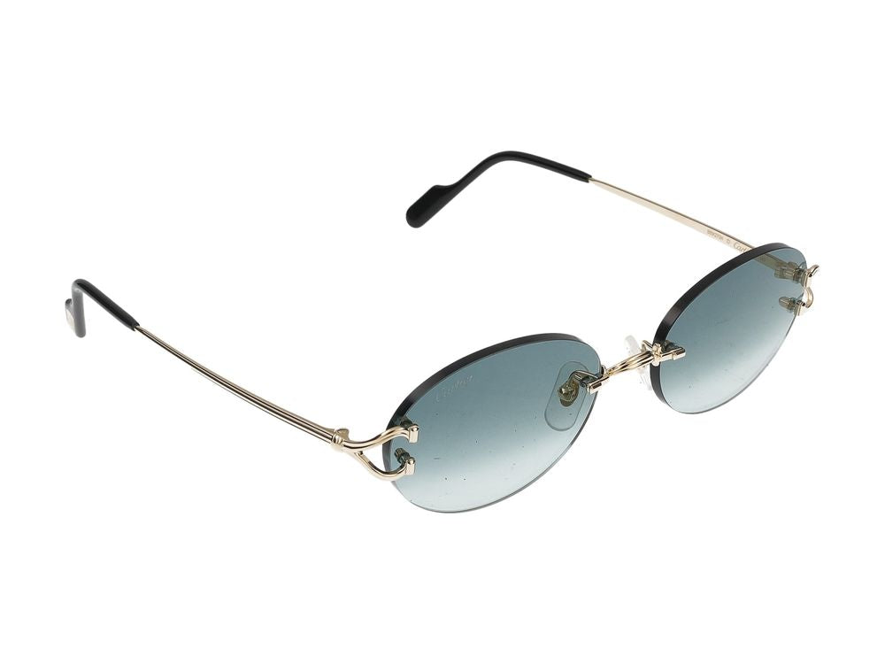 Elevate your eyewear collection with these stunning Cartier CT0551S sunglasses in luxurious gold with gradient green lenses. These rimless geometric frames feature an elegant, minimalist design with signature Cartier detailing at the temples, creating a sophisticated and timeless look.