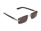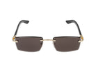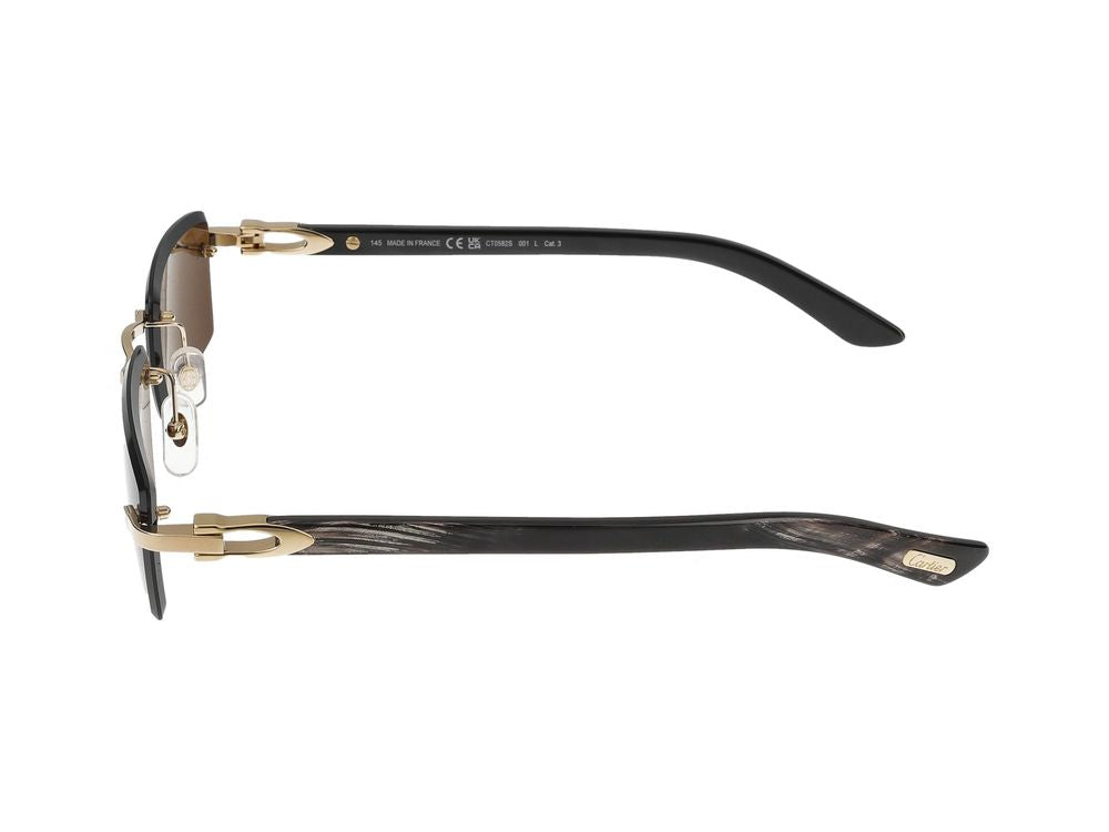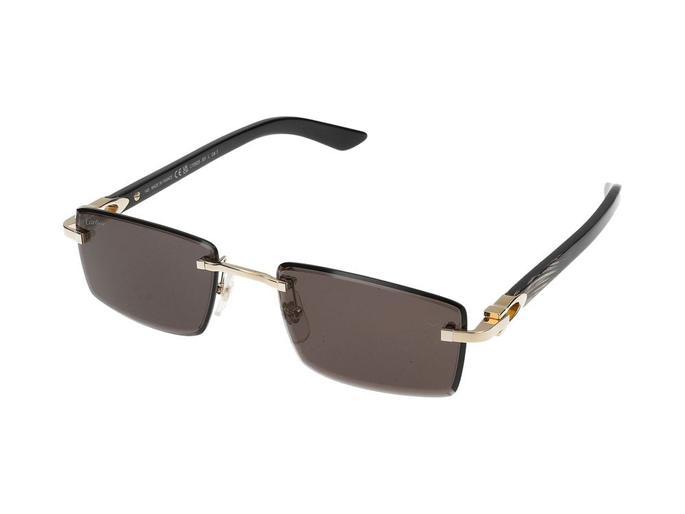 Elevate your eyewear collection with these sophisticated Cartier CT0582S sunglasses in a striking gold and black colorway. These rimless sunglasses feature sleek metal temples with signature Cartier detailing and dark grey lenses that provide both style and UV protection.