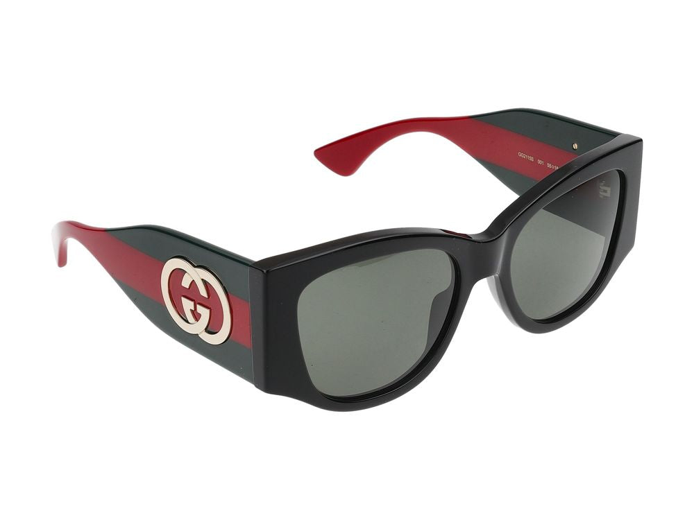 Elevate your eyewear collection with these stunning Gucci GG2115S sunglasses in classic black with green-grey lenses. These bold, square-framed sunglasses feature a sophisticated oversized silhouette with striking red interior temples that add a pop of signature Gucci style.