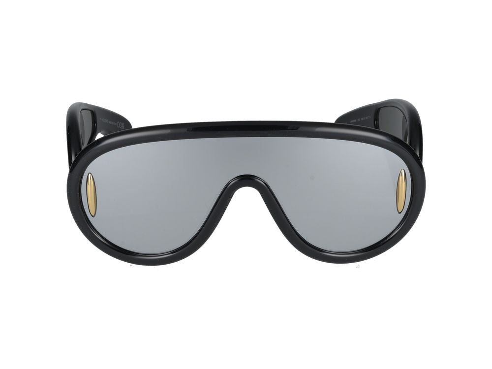Make a bold statement with these striking LOEWE shield sunglasses. Featuring a contemporary geometric silhouette with sleek black frames and sophisticated gray lenses, these luxury eyewear pieces offer both style and sun protection.