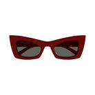 Make a bold statement with these striking Saint Laurent SL 702 sunglasses in a vibrant red hue. The distinctive cat-eye silhouette features a structured, angular frame that exudes confidence and modern sophistication.