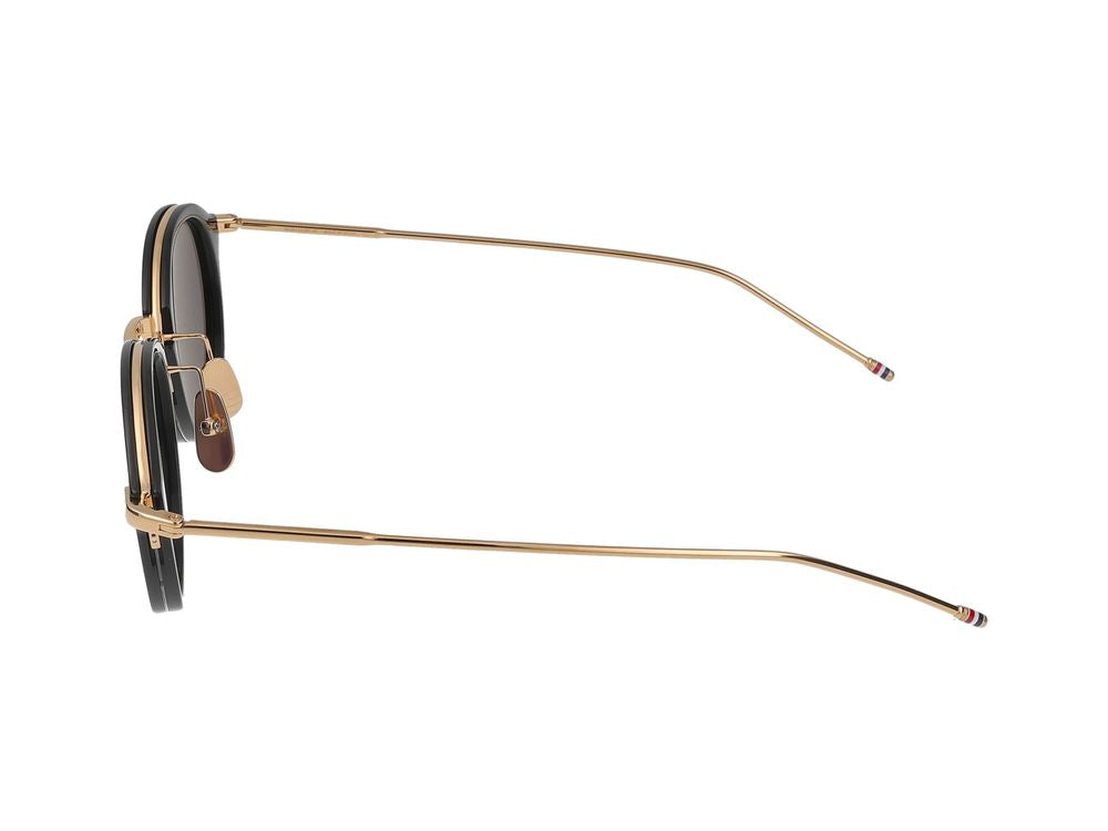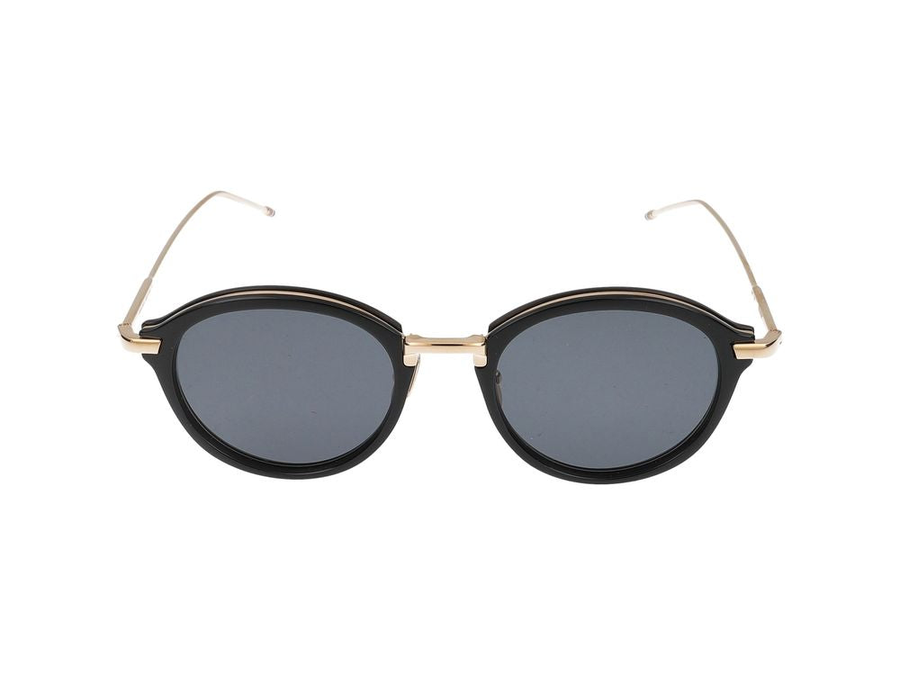 Elevate your eyewear collection with these sophisticated sunglasses from Thom Browne. Featuring a timeless round frame design with sleek black acetate and refined gold-tone metal temples, these sunglasses embody the brand's signature blend of classic American craftsmanship and modern luxury.