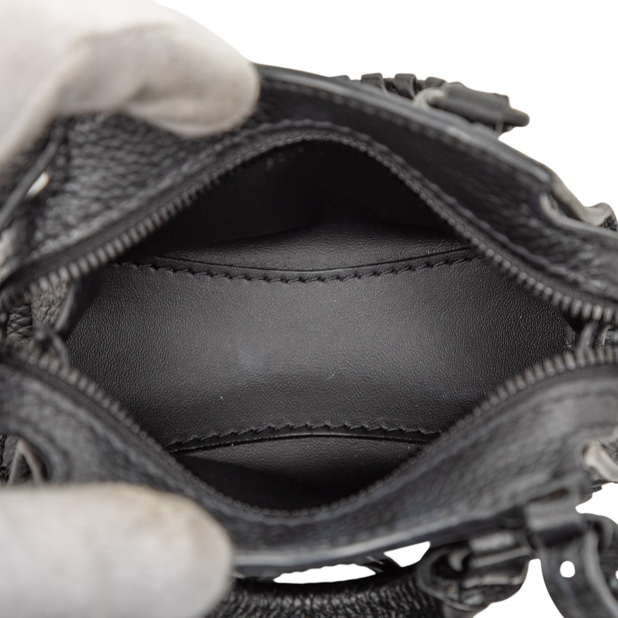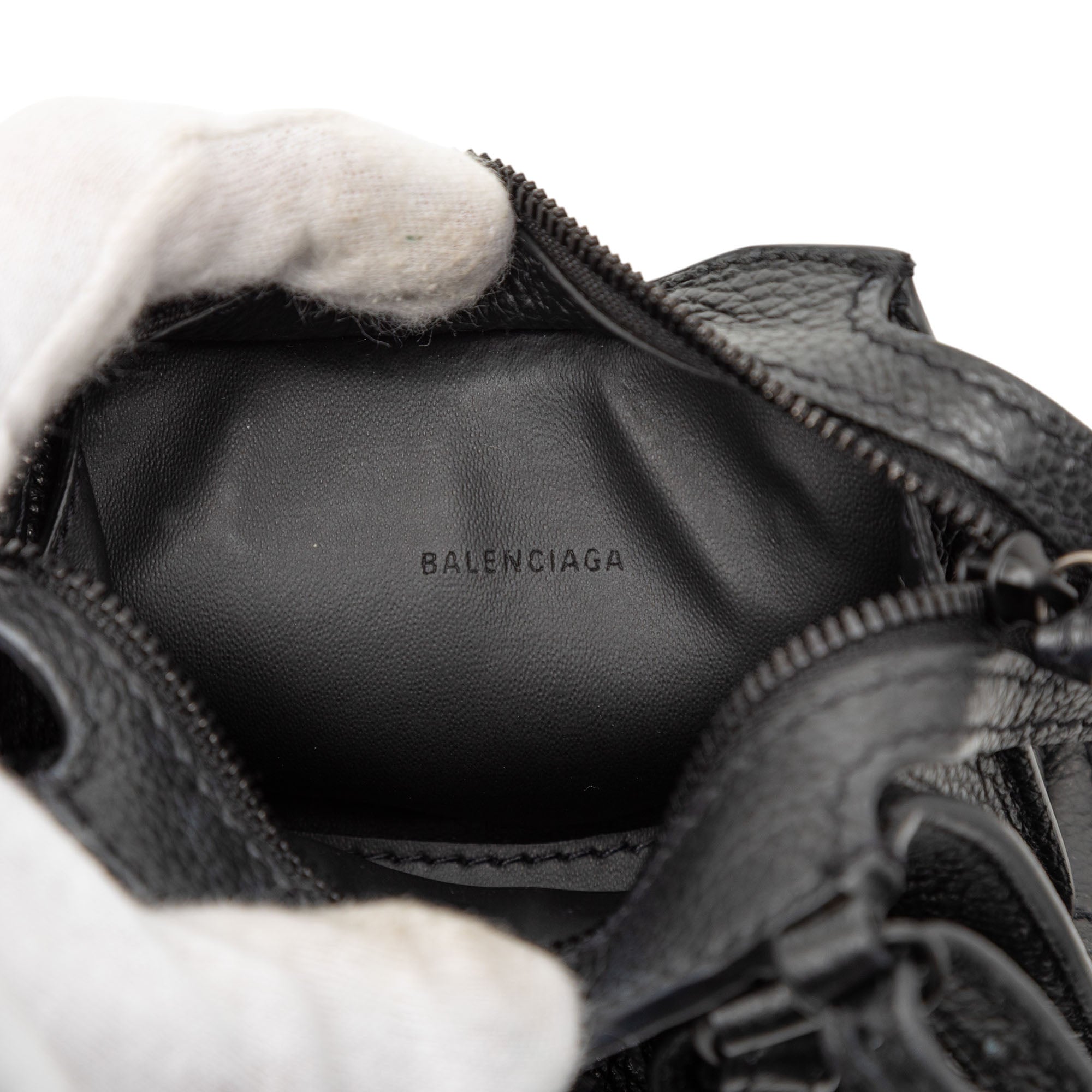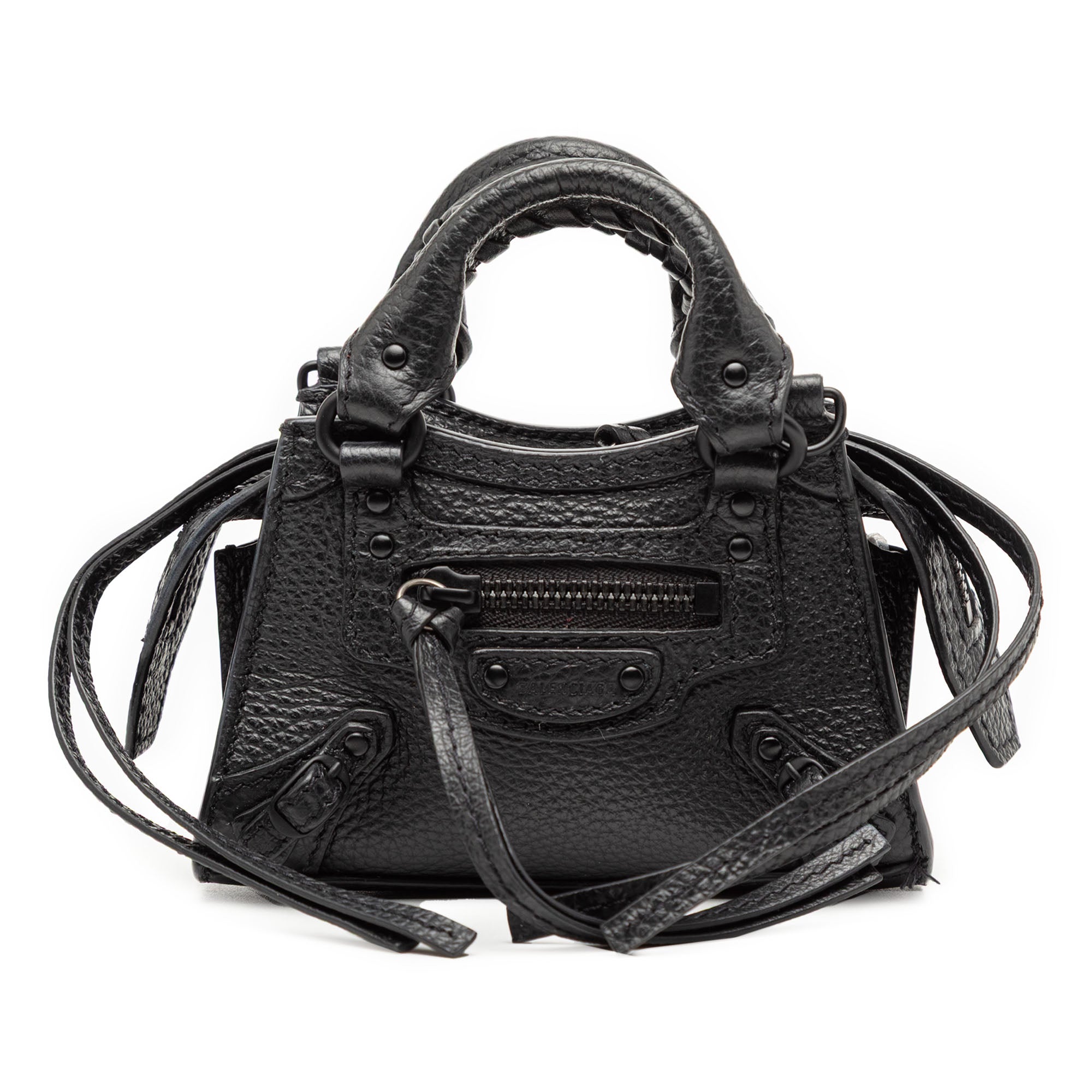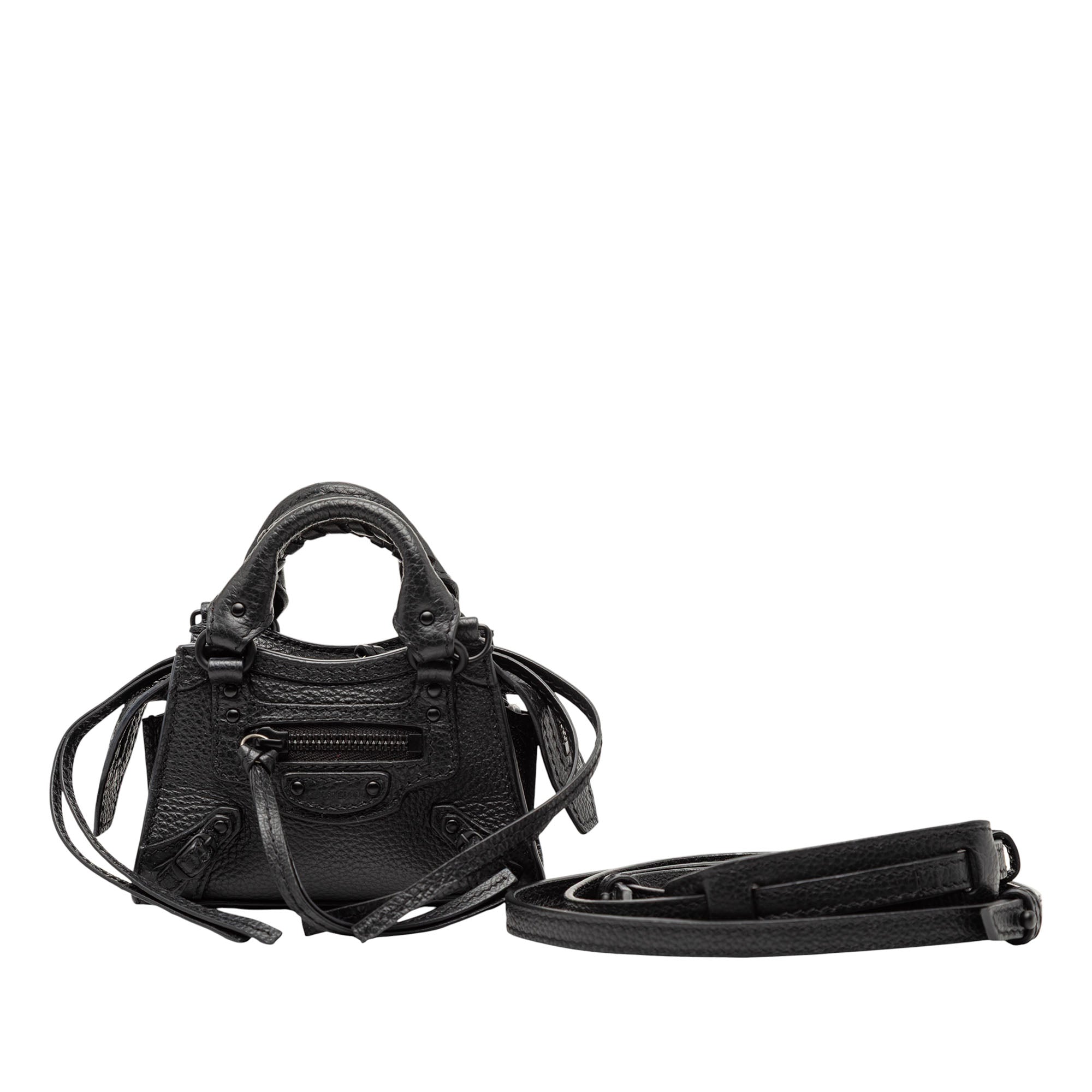 The Balenciaga Super Nano Neo Classic City Satchel is a coveted miniature version of the iconic City bag, crafted from luxurious grained calfskin leather. This ultra-compact design features signature rolled leather handles, a detachable flat shoulder strap for versatile styling, and a convenient exterior front zip pocket for easy access to essentials.