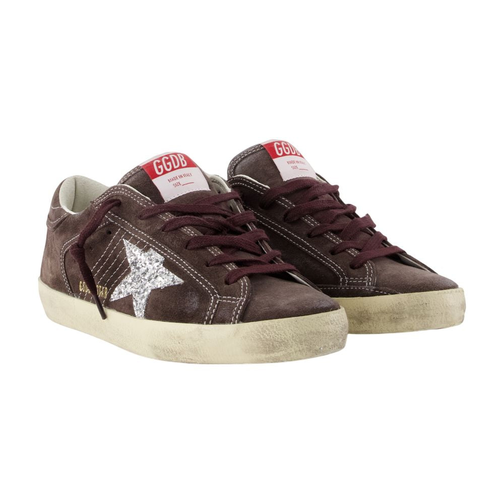 Elevate your casual style with these iconic Super Star Sneakers from Golden Goose. Crafted from premium suede in a rich brown tone, these low-top sneakers feature the brand's signature distressed aesthetic and metallic star appliqué for an effortlessly cool look. The lace-up design and vintage-inspired cream sole provide both comfort and style, making them perfect for everyday wear.