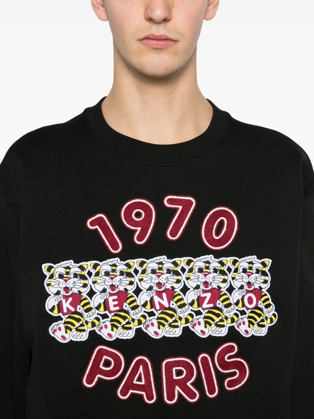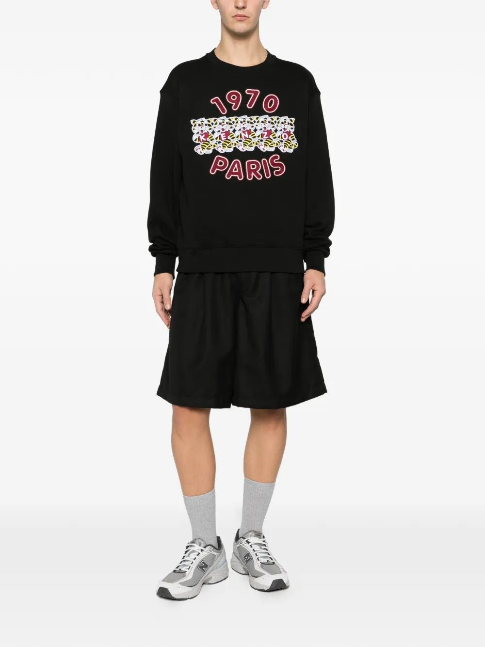 Elevate your casual wardrobe with this iconic Kenzo sweatshirt featuring a bold retro-inspired graphic. The eye-catching design showcases "1970 PARIS" with a playful leopard print detail in vibrant pink tones against a classic black backdrop, perfectly capturing Kenzo's signature blend of Parisian chic and wild creativity.