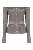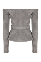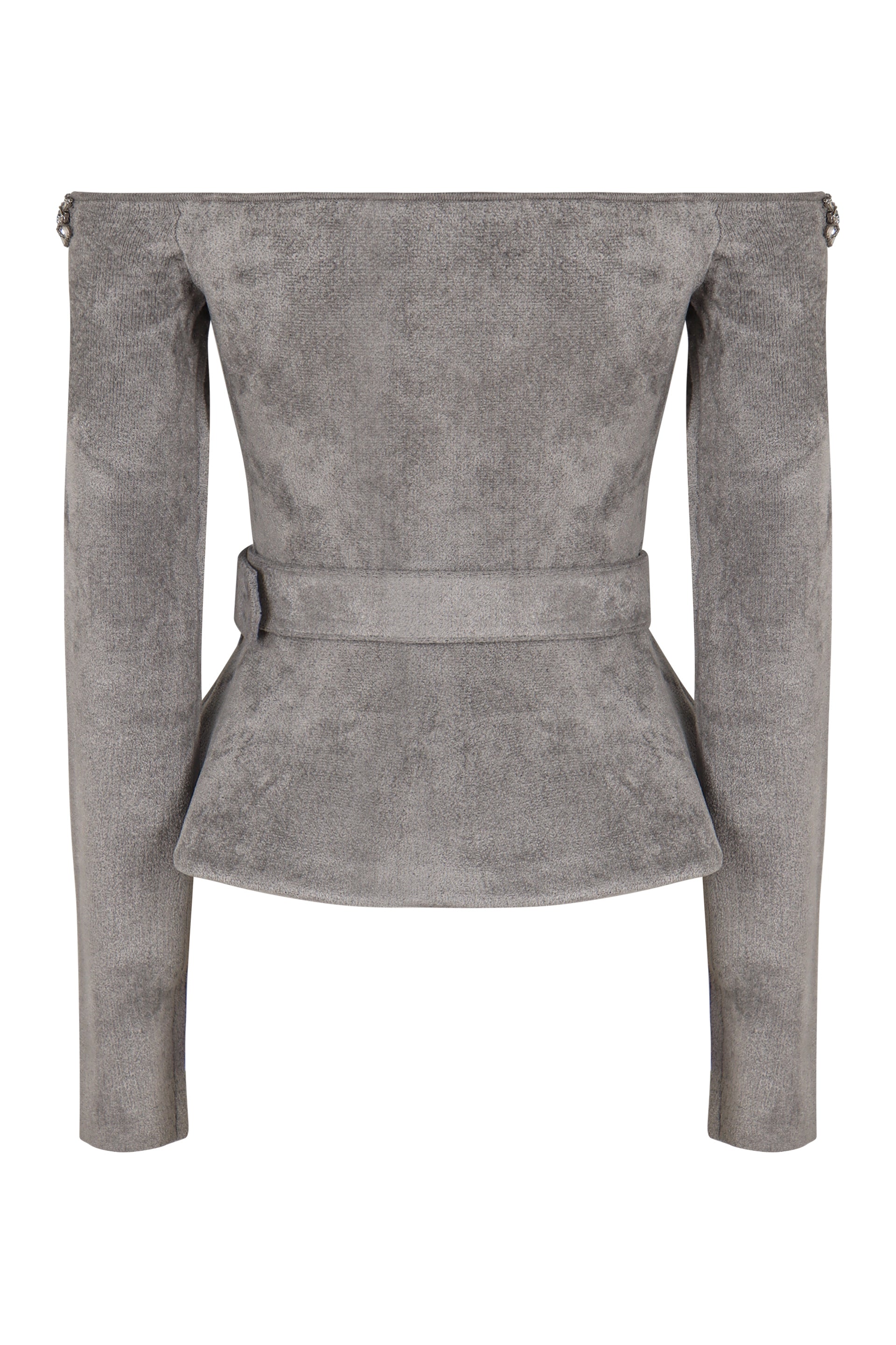SWEATER IN GRAY FABRIC, FEATURING A LONG-SLEEVE DESIGN AND A FITTED SILHOUETTE. IT HAS A FRONT DECORATION WITH BUTTONS AND A WAIST BELT WITH PEPLUM THAT ACCENTUATES THE SILHOUETTE. THE FINISH IS SMOOTH AND MODERN, SUITABLE FOR FORMAL OCCASIONS OR FOR A SOPHISTICATED LOOK IN EVERYDAY LIFE.
