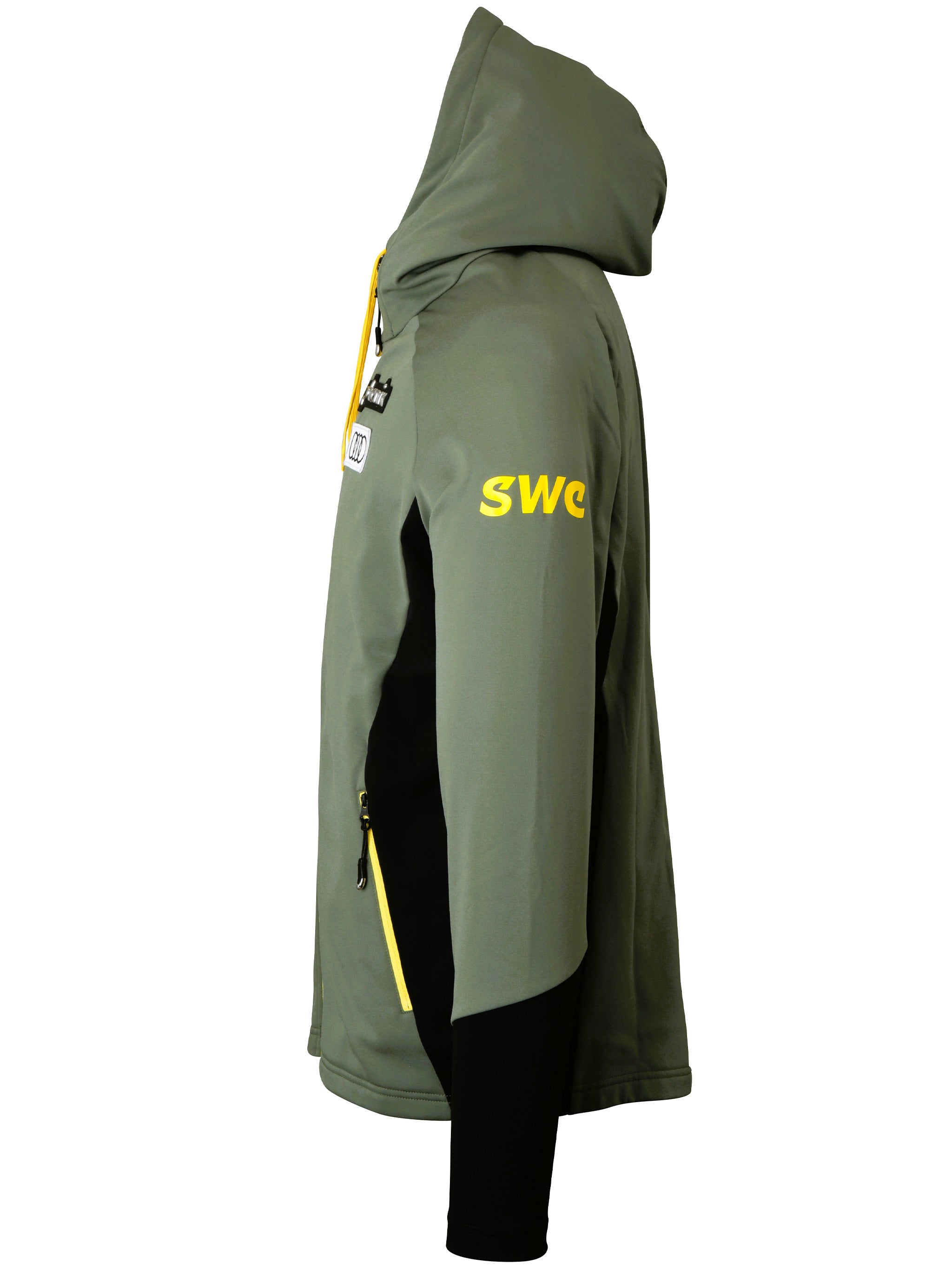 Elevate your athletic wardrobe with this Sweden Khaki Polyester Ski Sweater from Phenix. This performance-ready hooded jacket features a striking olive green colorway with bold yellow zipper detailing and authentic ski team sponsor patches, bringing an authentic alpine aesthetic to your look.
