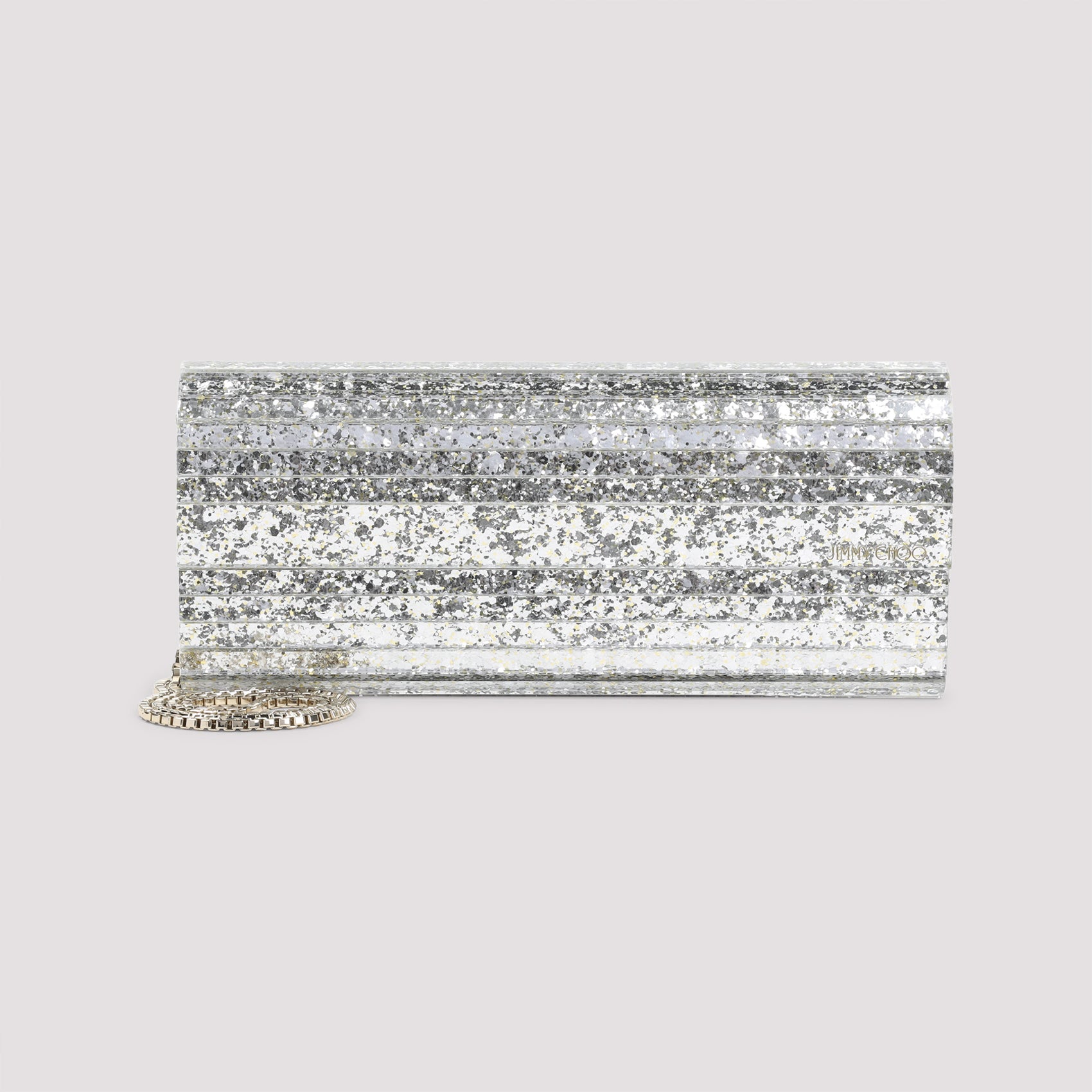Introducing the SWEETIE clutch by Jimmy Choo, a dazzling accessory that brings instant glamour to any evening ensemble. This stunning piece features an all-over glitter finish in shimmering silver, creating a captivating play of light with every movement.