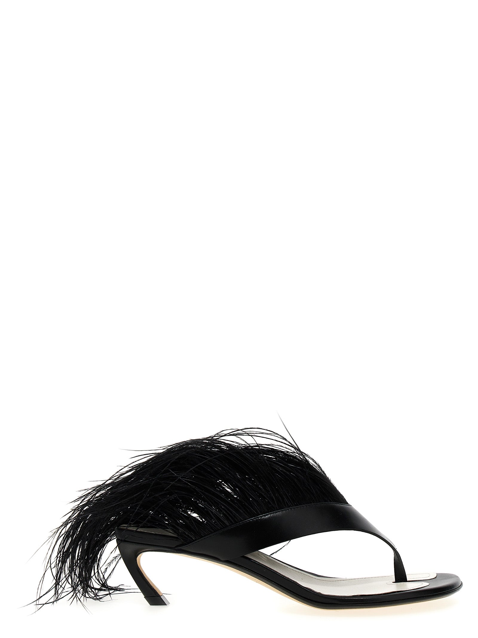 Elevate your evening ensemble with Lanvin's exquisite 'Talon Swing' sandals, a stunning fusion of sophistication and playful elegance. These luxurious leather sandals feature a sleek thong silhouette adorned with dramatic tone-on-tone feather embellishments that add movement and texture with every step.