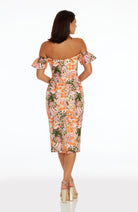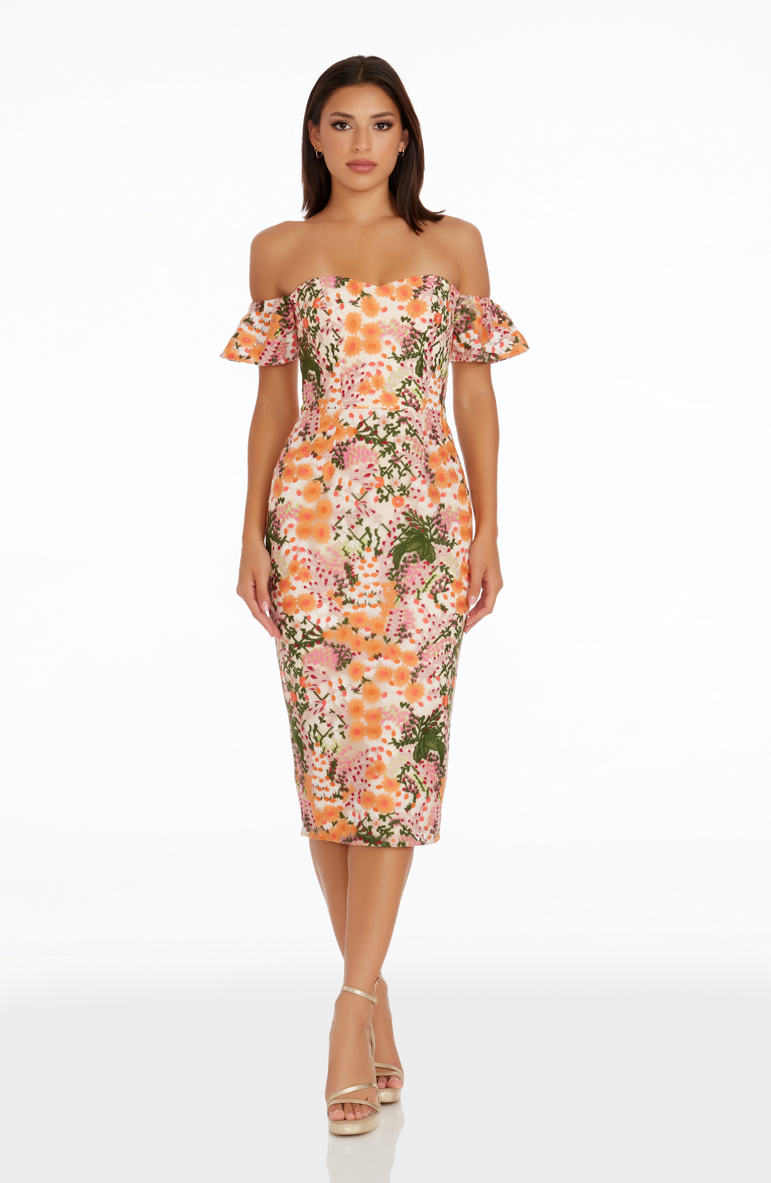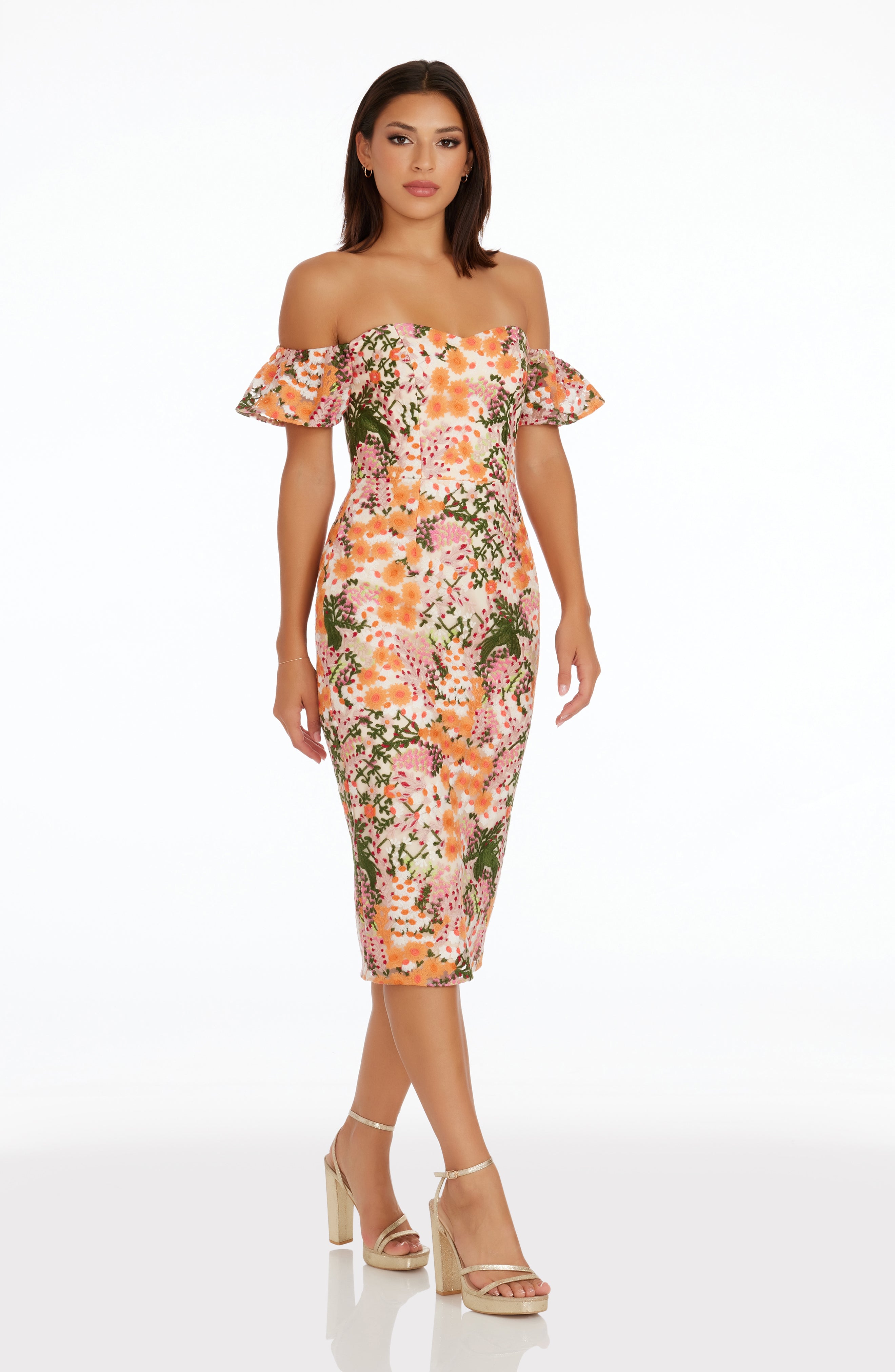 Featuring a sweetheart neckline, off-the-shoulder sleeves, and a curve flattering body-con silhouette. The Tara Dress offers unique floral design, and an over the knee hemline.