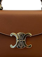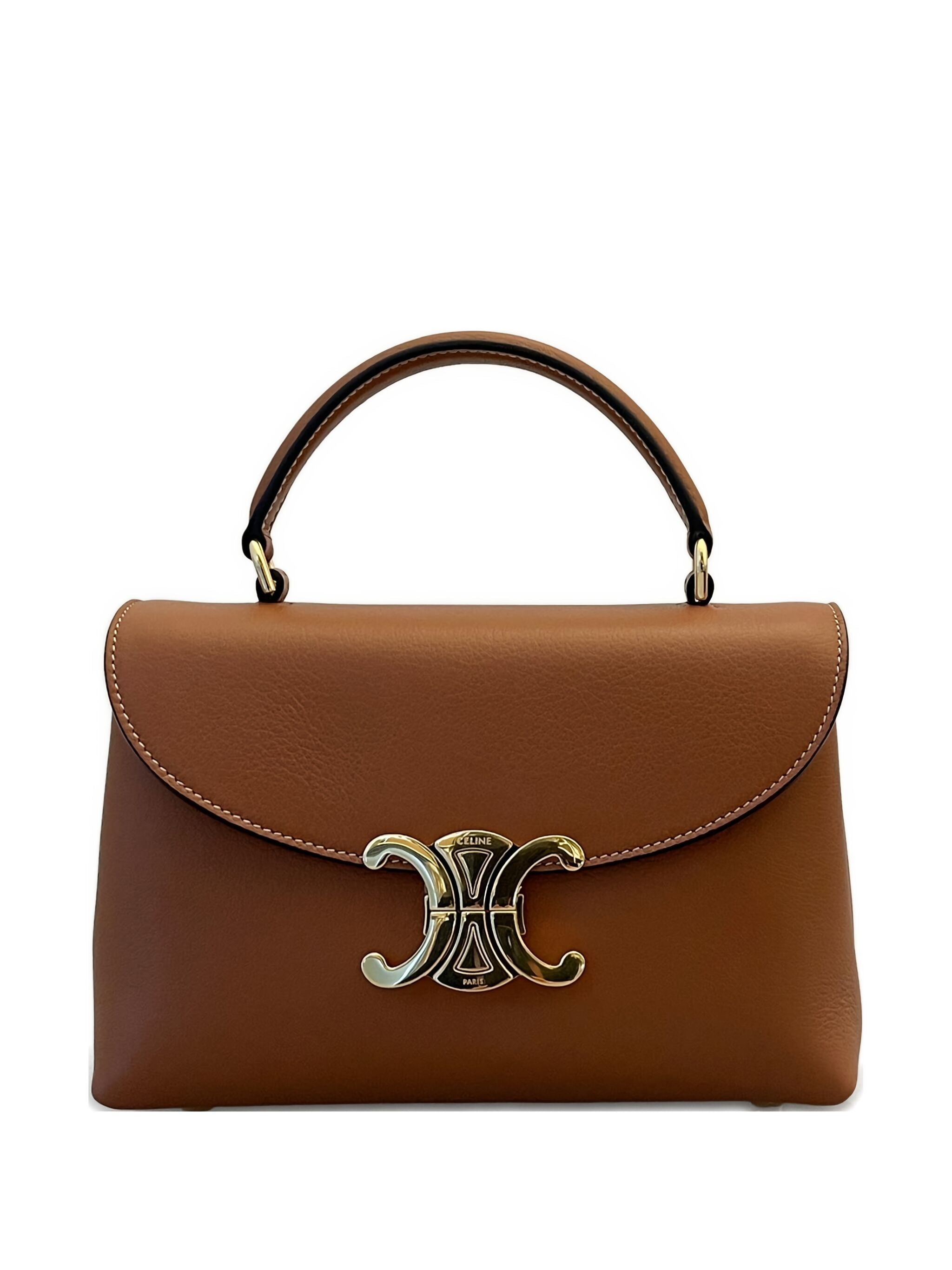 This beautifully structured handbag features rich brown leather with contrast stitching and the iconic Celine logo clasp at the center. The top handle design makes it perfect for carrying by hand or tucking under your arm, while the flap closure keeps your essentials secure.