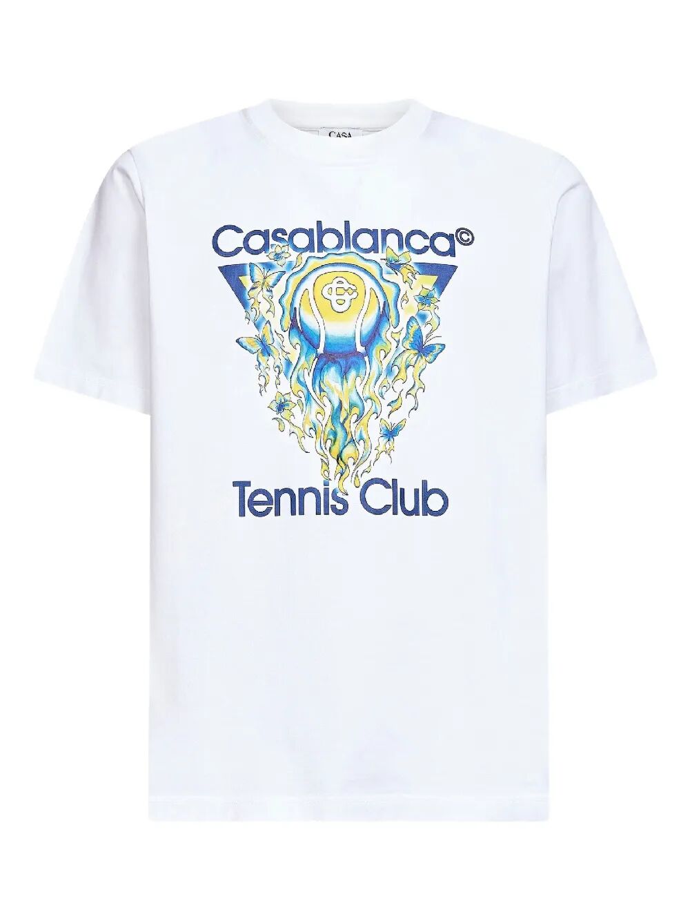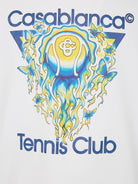 Elevate your casual wardrobe with the "Tennis Club Icon Classic" T-Shirt from Casablanca. This premium tee features a striking graphic design showcasing a vintage-inspired tennis ball motif with vibrant blue and yellow accents, complemented by the iconic Casablanca and Tennis Club branding. Crafted from 100% organic cotton, this short-sleeve t-shirt offers exceptional comfort and breathability for all-day wear.