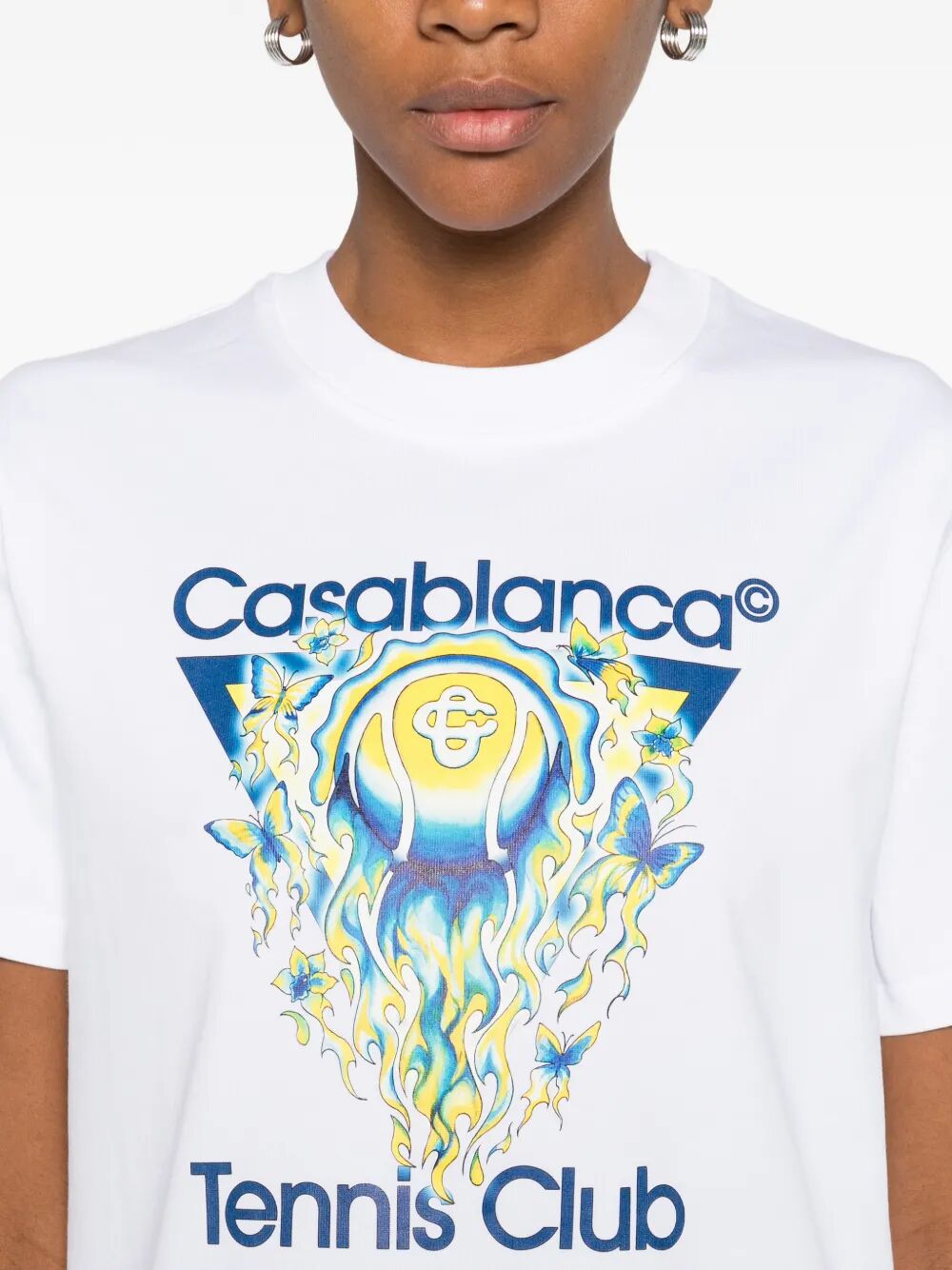 Crafted from 100% organic cotton, this t-shirt offers exceptional comfort and breathability while maintaining an eco-conscious approach to luxury fashion. The crisp white base provides the perfect canvas for the vibrant blue and yellow graphic, creating a piece that effortlessly transitions from weekend leisure to casual outings.