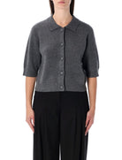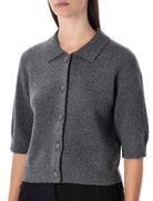 KNITTED FROM A SOFT WOOL-CASHMERE BLEND, IT FEATURES A CLASSIC COLLAR, BUTTON FRONT CLOSURE, AND A SLIGHTLY SHORT LENGTH THAT FLATTERS THE FIGURE.