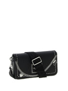 BLACK EMBOSSED LOGO CHAIN PRINT MAGNETIC FLAP CLOSURE ADJUSTABLE REMOVABLE SHOULDER STRAP STITCHED DETAILING