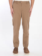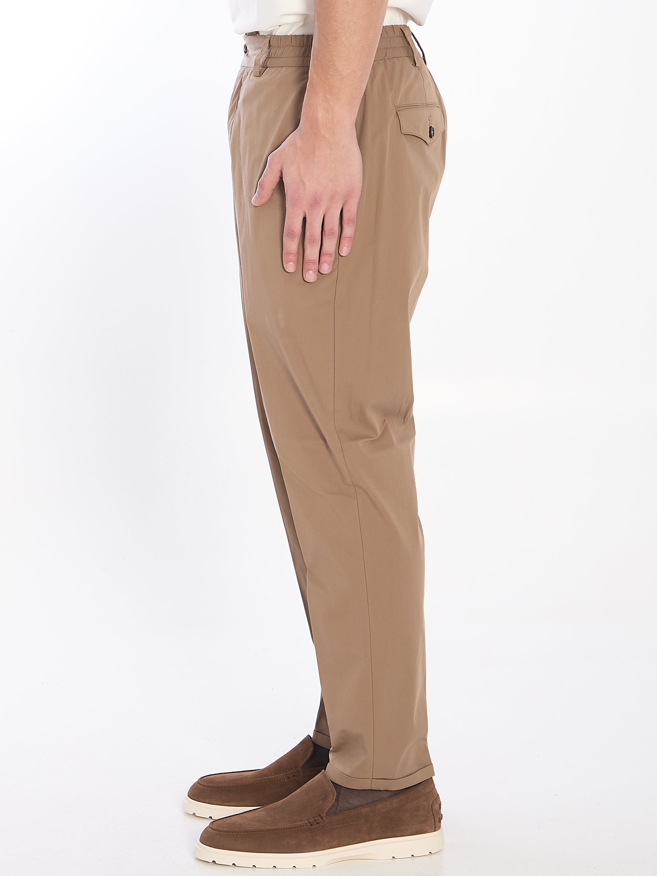The Rebel trousers in brown cotton blend. They feature an elasticized waistband, button closure, belt loops, two welt side pockets, and two flap pockets with buttons on the back.