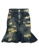 Designed with classic five-pocket styling and a front metal logo detail, this mini skirt combines rebellious attitude with refined craftsmanship. The flounced hem adds a feminine touch to the rugged denim aesthetic, while the zip and button closure ensures a secure, comfortable fit.