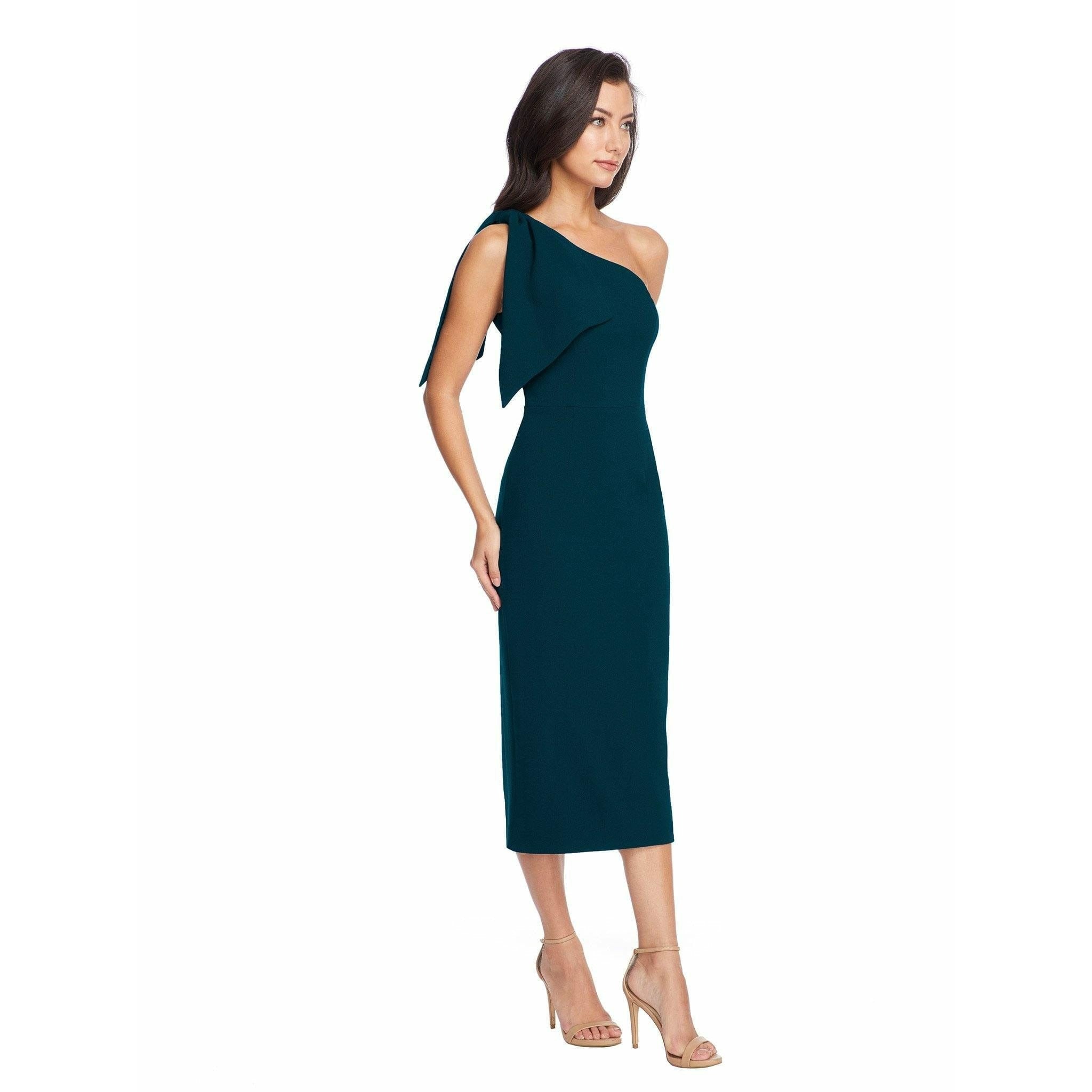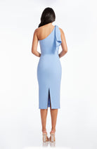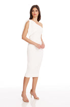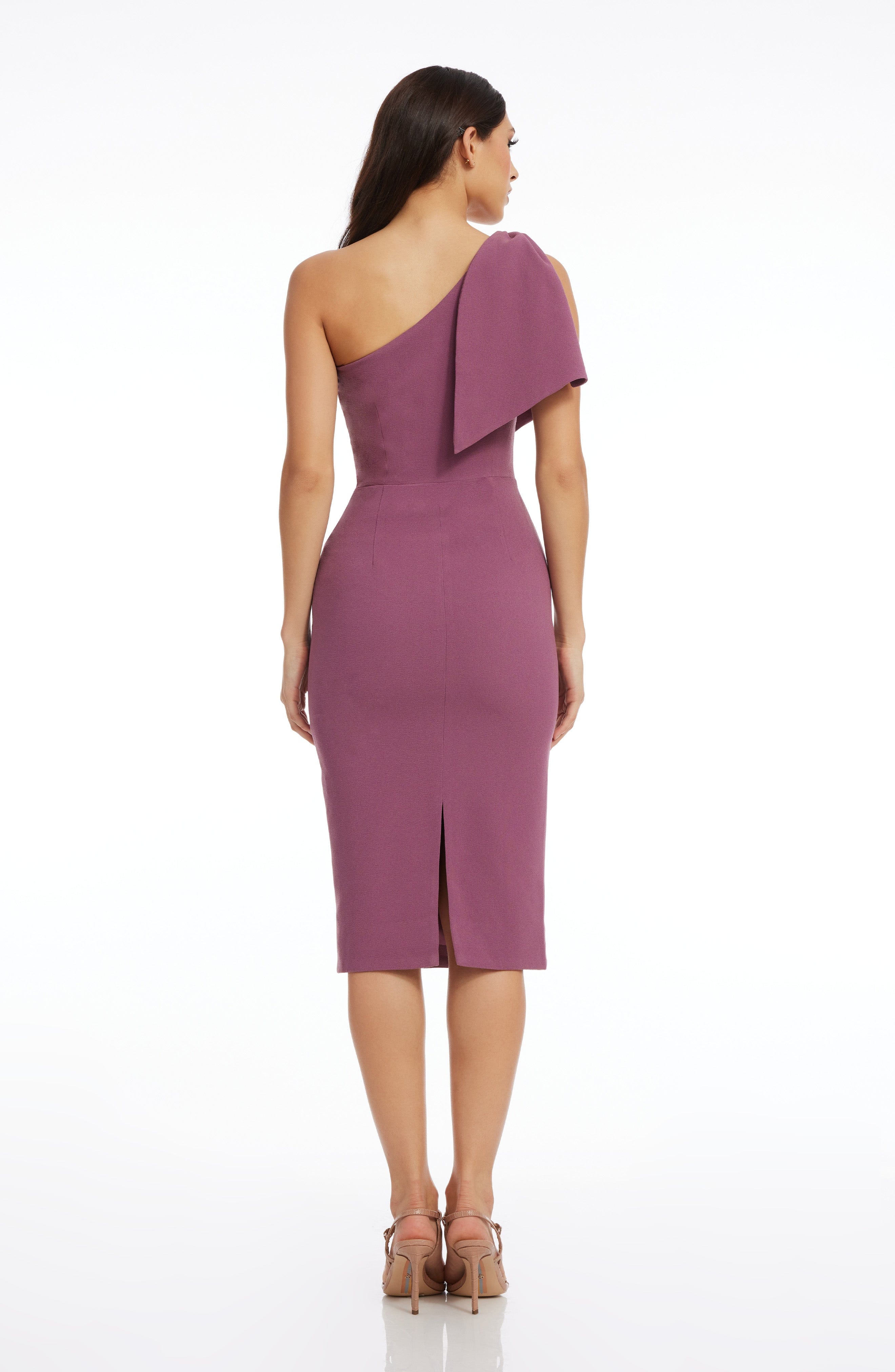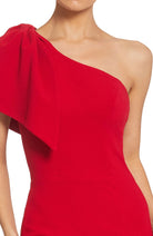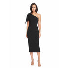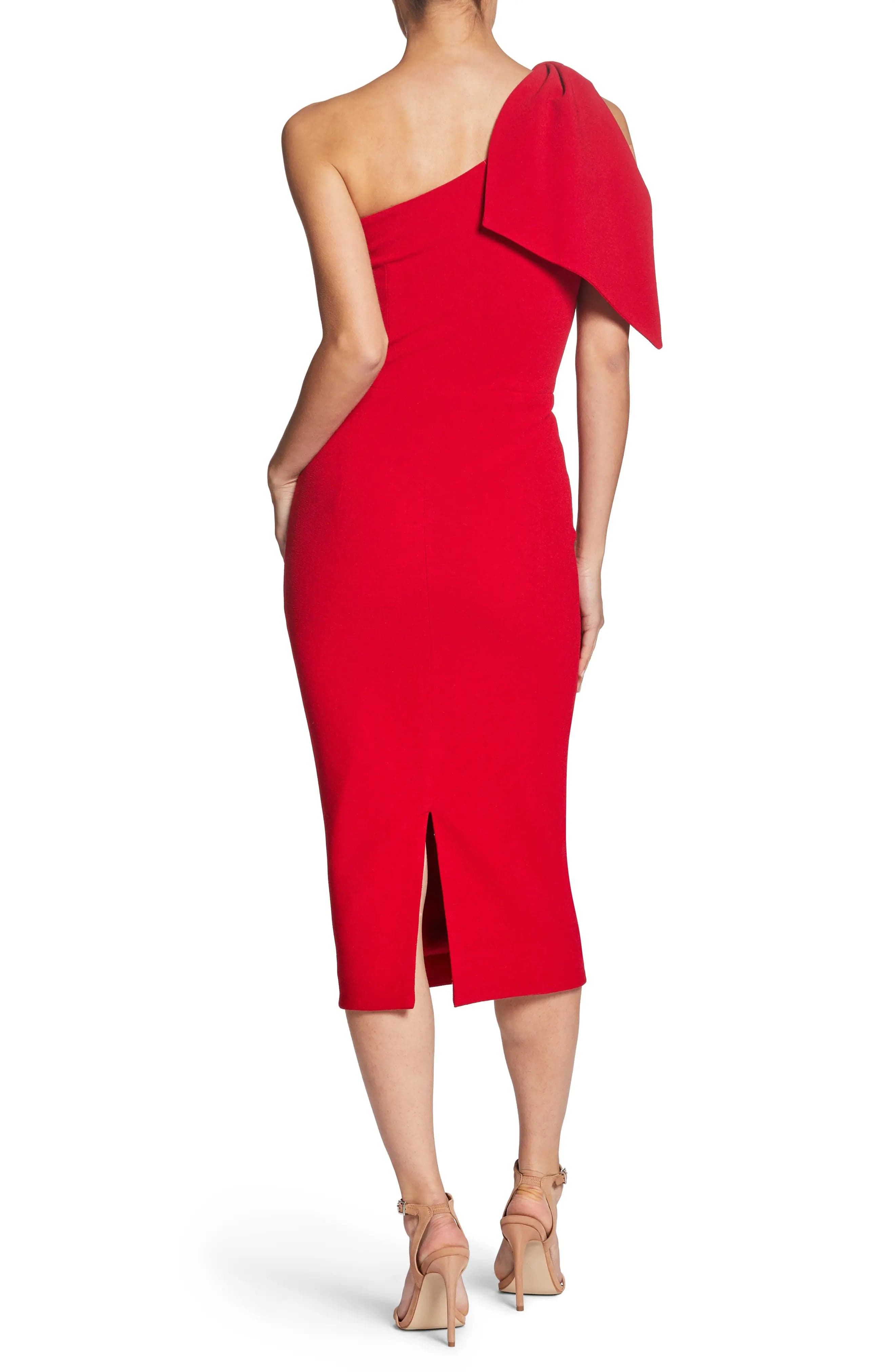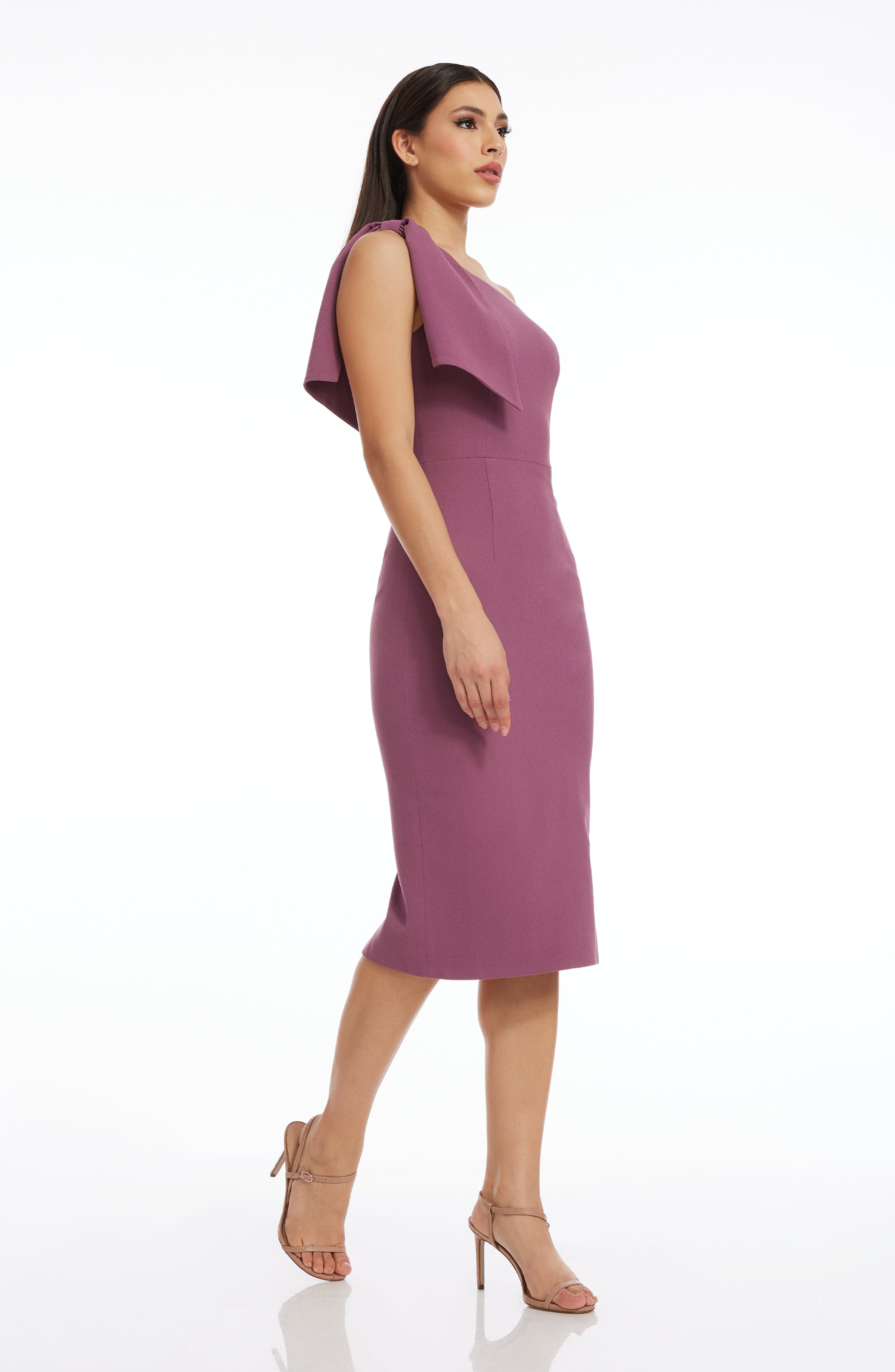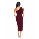 The Tiffany is an elegant asymmetrical dress made in our stretch crepe material. A large bow drapes over the single shoulder strap. The form-fitting silhouette has a straight, midi-length skirt that tapers in at the waist completed with a back slit.